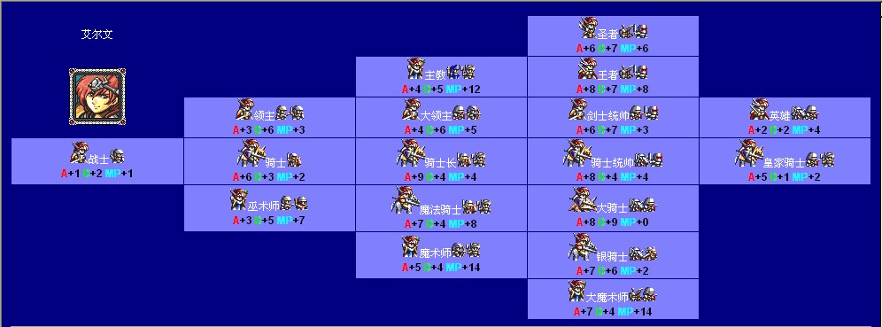 主角艾尔文有2种特有的职业:英雄和王者。两种究极职业:英雄和皇家骑士。皇家骑士攻击力高,但是容易受地形影响(皇家骑士的攻击方式太帅了);英雄的防御力比较高。在用魔导石练级时转成王者比较有利。 (另存为到桌面可看大图~~~)
