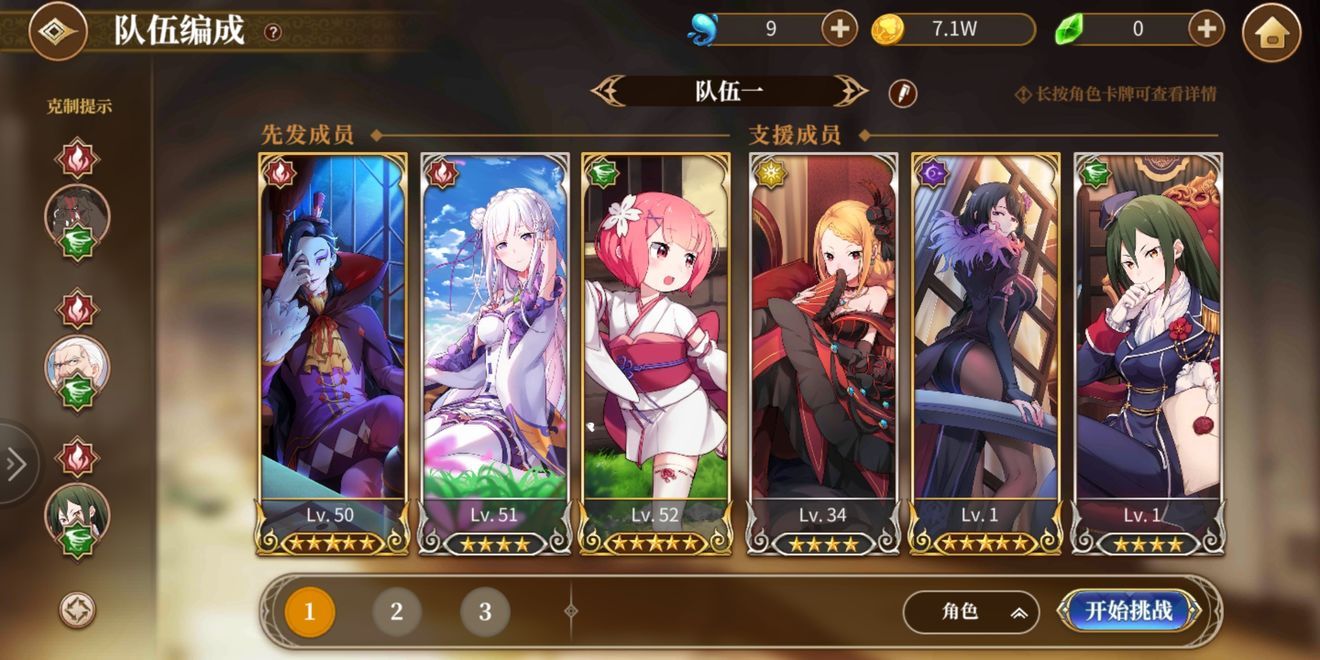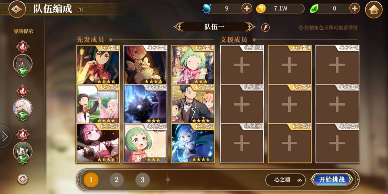 出手顺序(括号内为魔法器)依次为小丑男罗兹瓦尔(暴击无视防御),白雪公主爱蜜莉雅(特殊技能减cd+暴击),幼年红鬼拉姆(回蓝戒指)。
