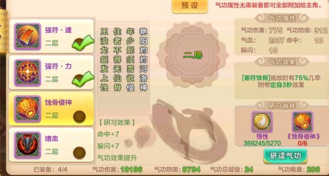 寒符蚀骨:邪符斩杀技能,对气血低于60%的当前目标遭成的最终伤害为2倍。配合气功蚀骨侵神,更可起到控制作用。