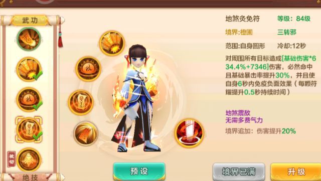 地煞灸免符:必带技能!群攻技能,伤害高,必然命中,且基础暴击提高30%,并且使自身6秒内免疫负面效果。既加状态,伤害也高,还免负面效果。必带!