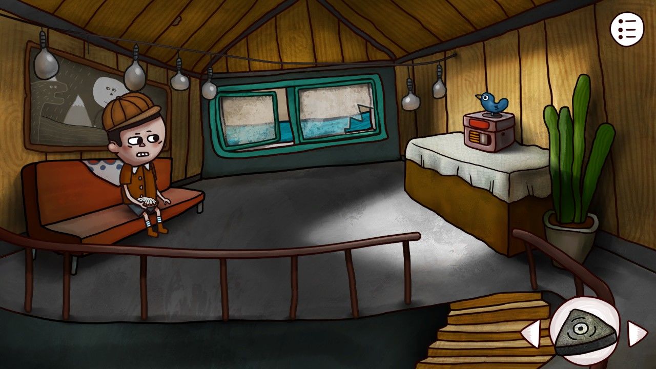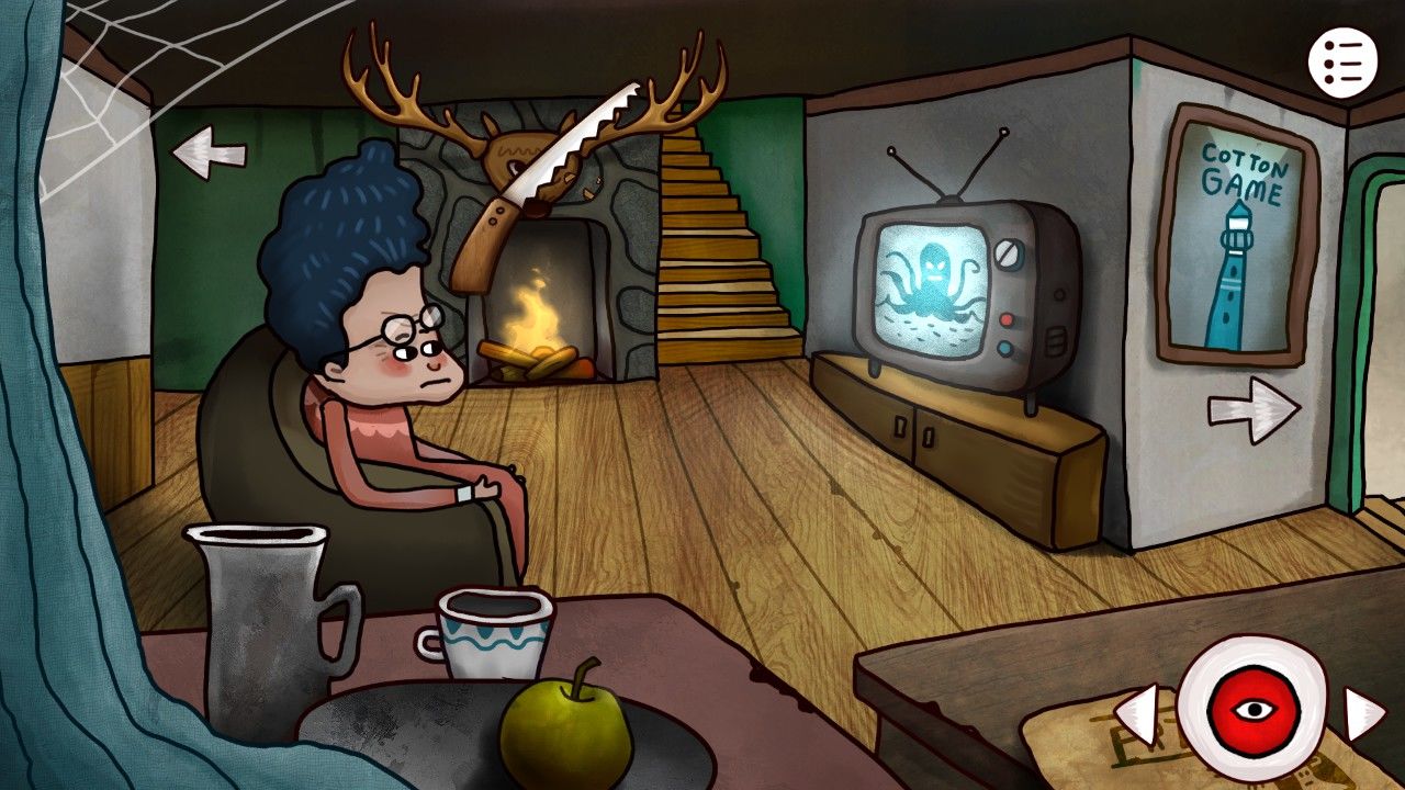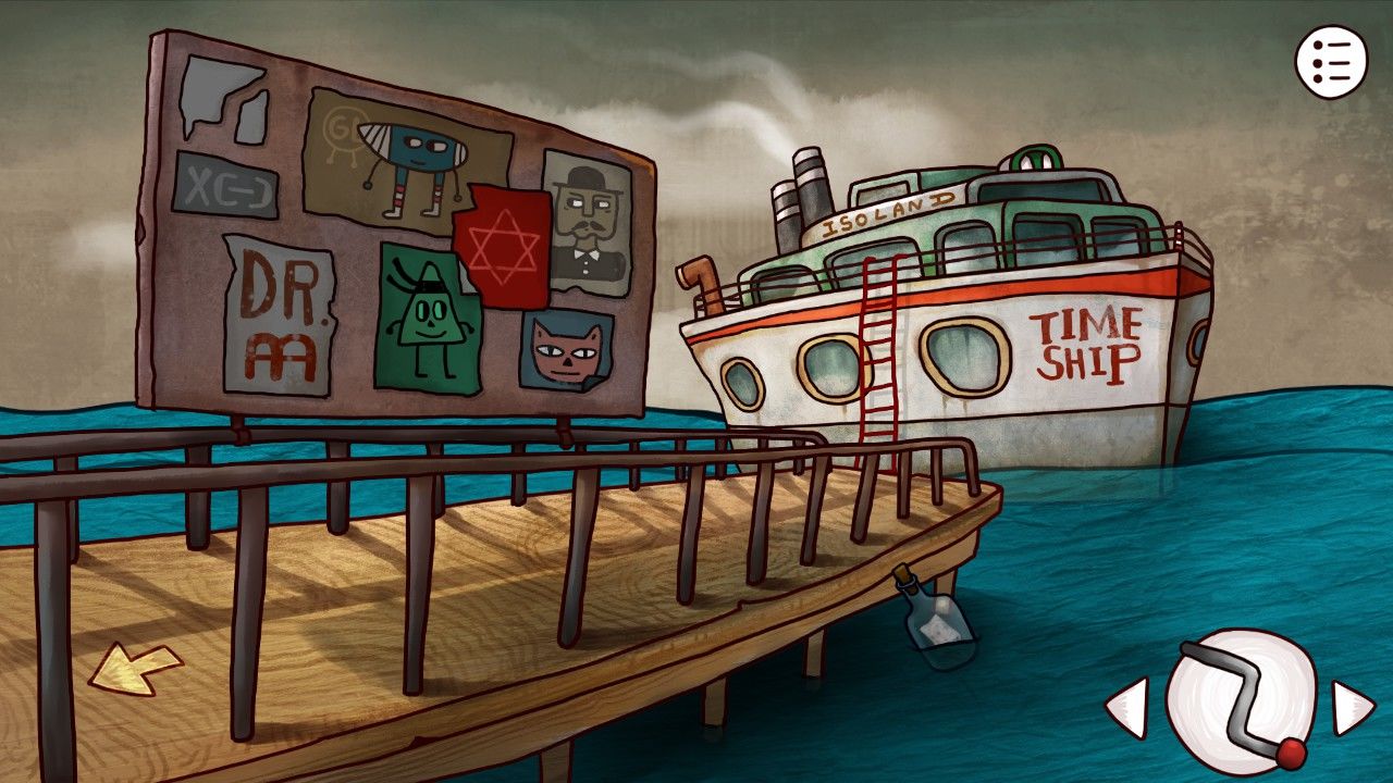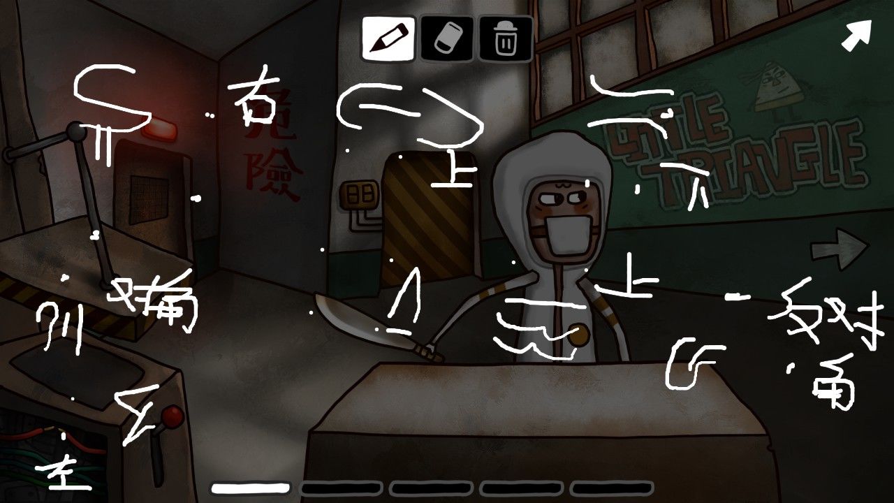 点击画板,发现画板的图像和床边桌子上订着的纸上的内容很像,机智的你觉得这一定是个后面用到的重要线索,于是你决定在屏幕右上角的笔记记下来或者给他拍张照/截个图。走出房间,来到客厅,发现顶着一头海藻的老妇人安详的坐在沙发上看电视,与老妇人对话,得知:1.邮筒里有船票;2.邮筒需要钥匙;3.工厂的门有机关;4.楼上有时间机器;5.开启时间的密码在本子上;6.楼上需要用铅笔涂涂写写。