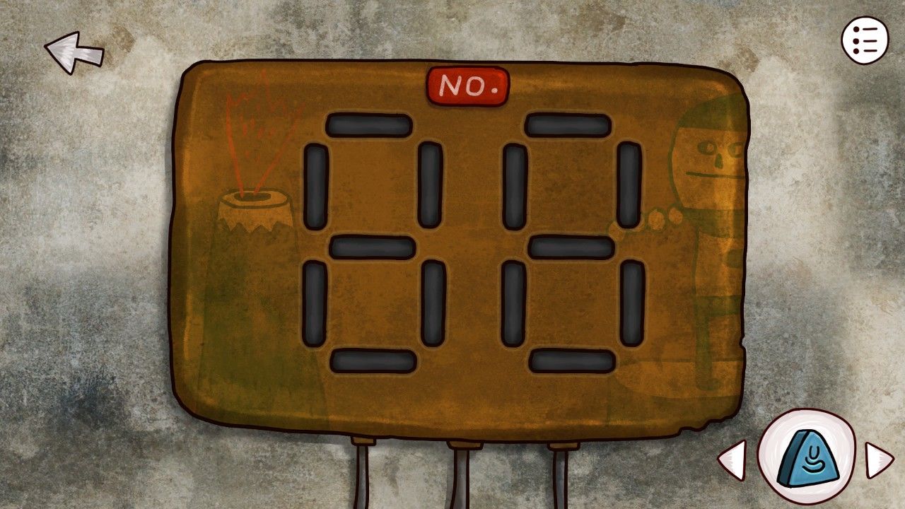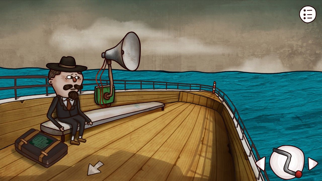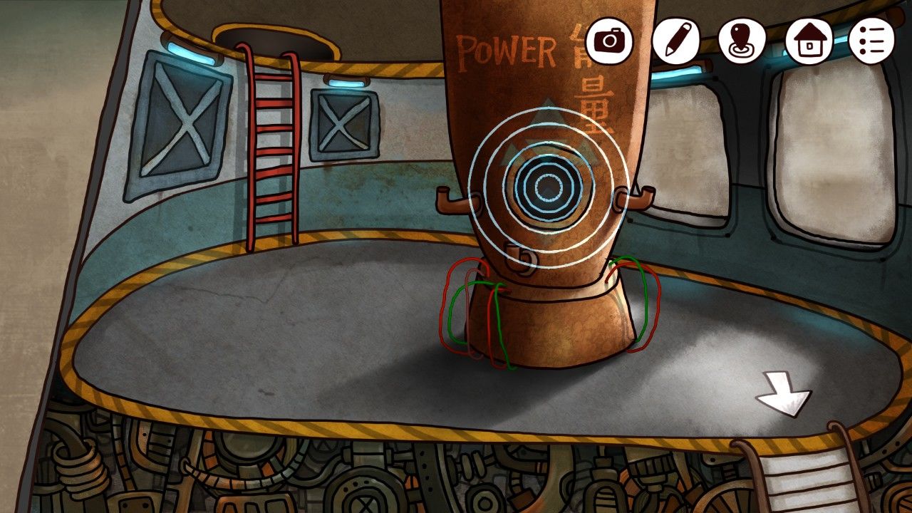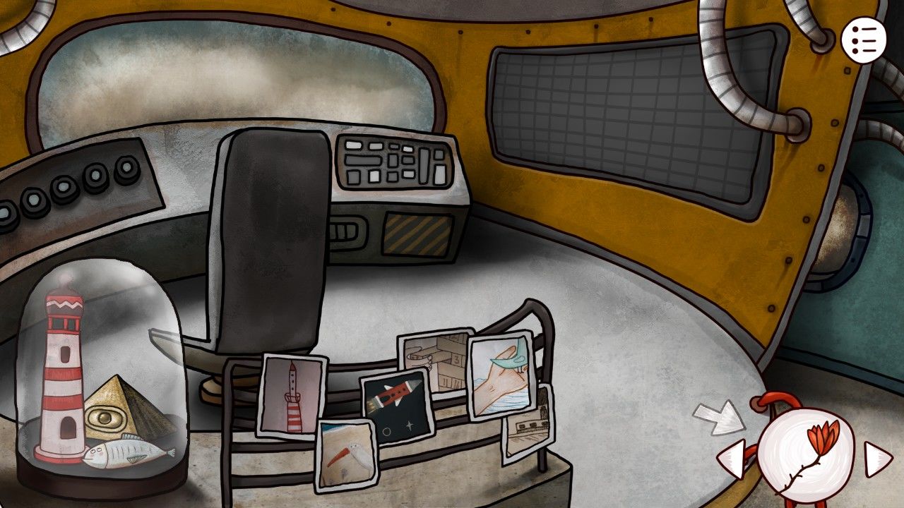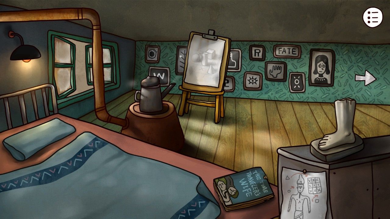 点击画板,发现画板的图像和床边桌子上订着的纸上的内容很像,机智的你觉得这一定是个后面用到的重要线索,于是你决定在屏幕右上角的笔记记下来或者给他拍张照/截个图。走出房间,来到客厅,发现顶着一头海藻的老妇人安详的坐在沙发上看电视,与老妇人对话,得知:1.邮筒里有船票;2.邮筒需要钥匙;3.工厂的门有机关;4.楼上有时间机器;5.开启时间的密码在本子上;6.楼上需要用铅笔涂涂写写。