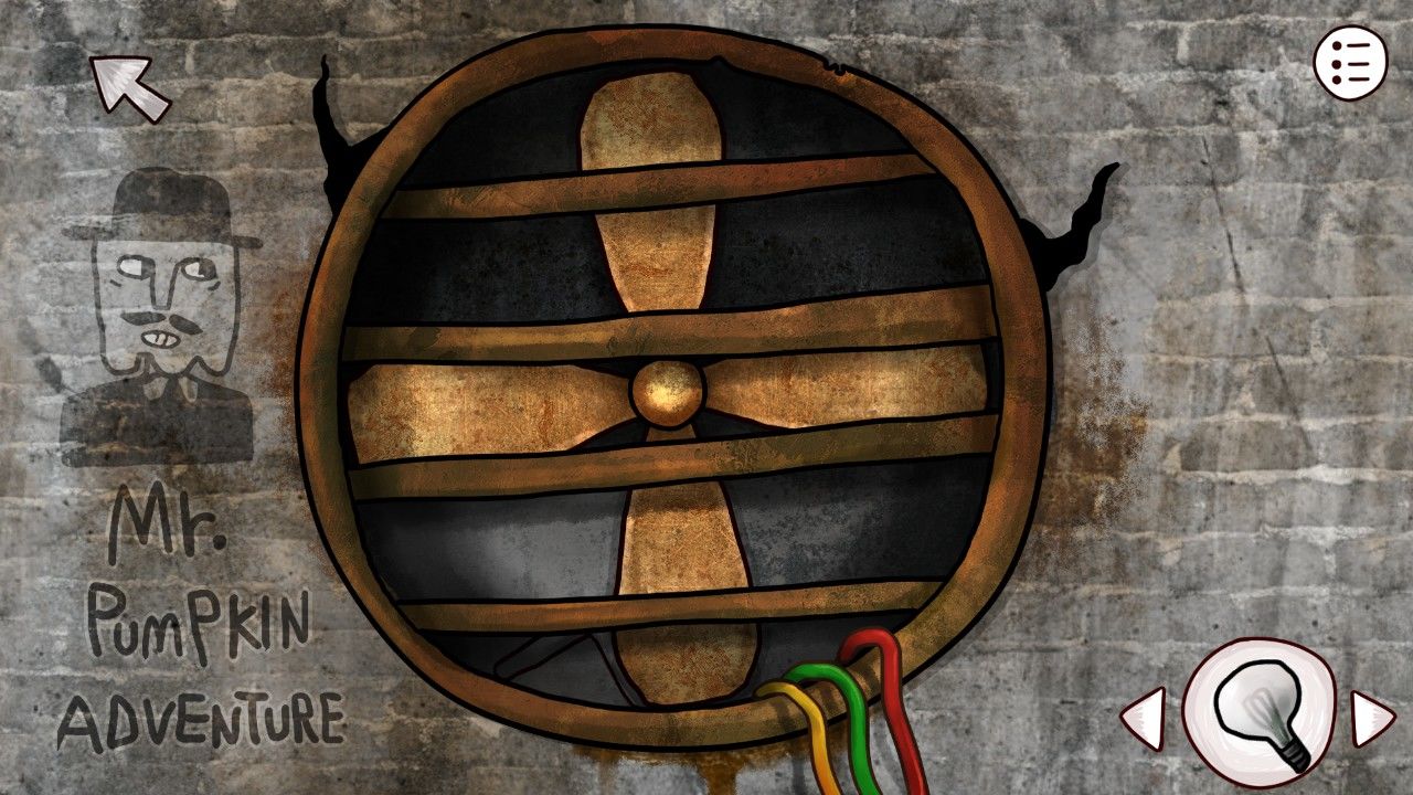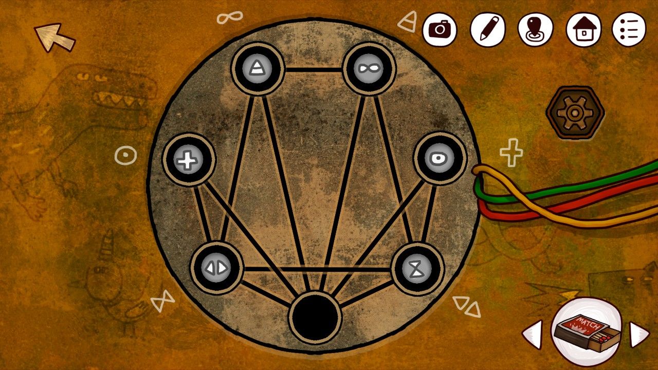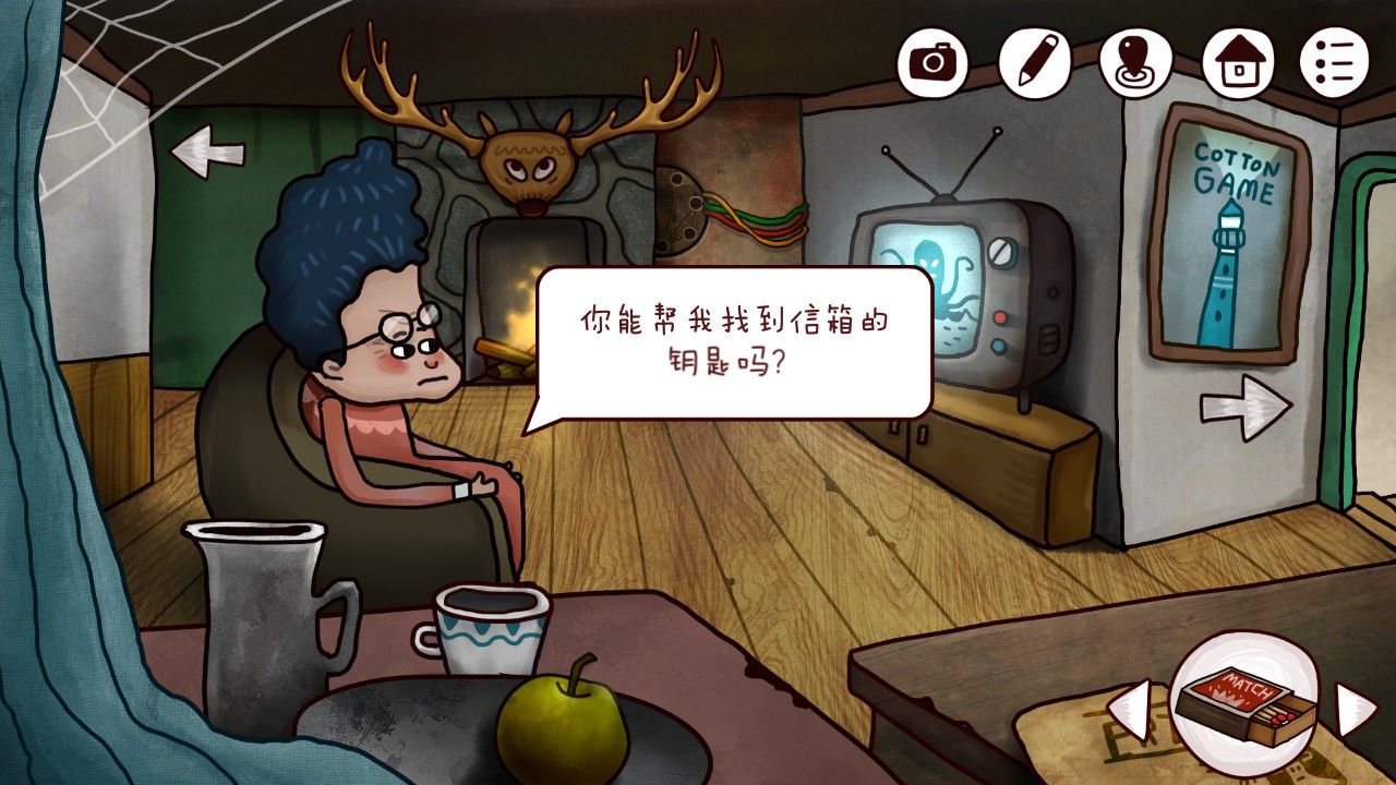 结束对话,在房间收集要素,发现桌子上的火柴、蓝莓都可以拿起来,果断搜集之,发现壁炉上的右边鹿角点击会晃动,于是细心的你决定以后有新道具可以来这里试试。虽然好奇,但是生性谨慎的你决定晚一点在出门,不妨先上楼看看老人家究竟在阁楼上鼓捣什么。点击电线连着的机关,在这里遇到游戏的第一个机关门。
