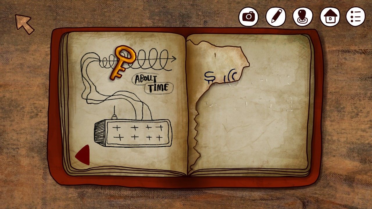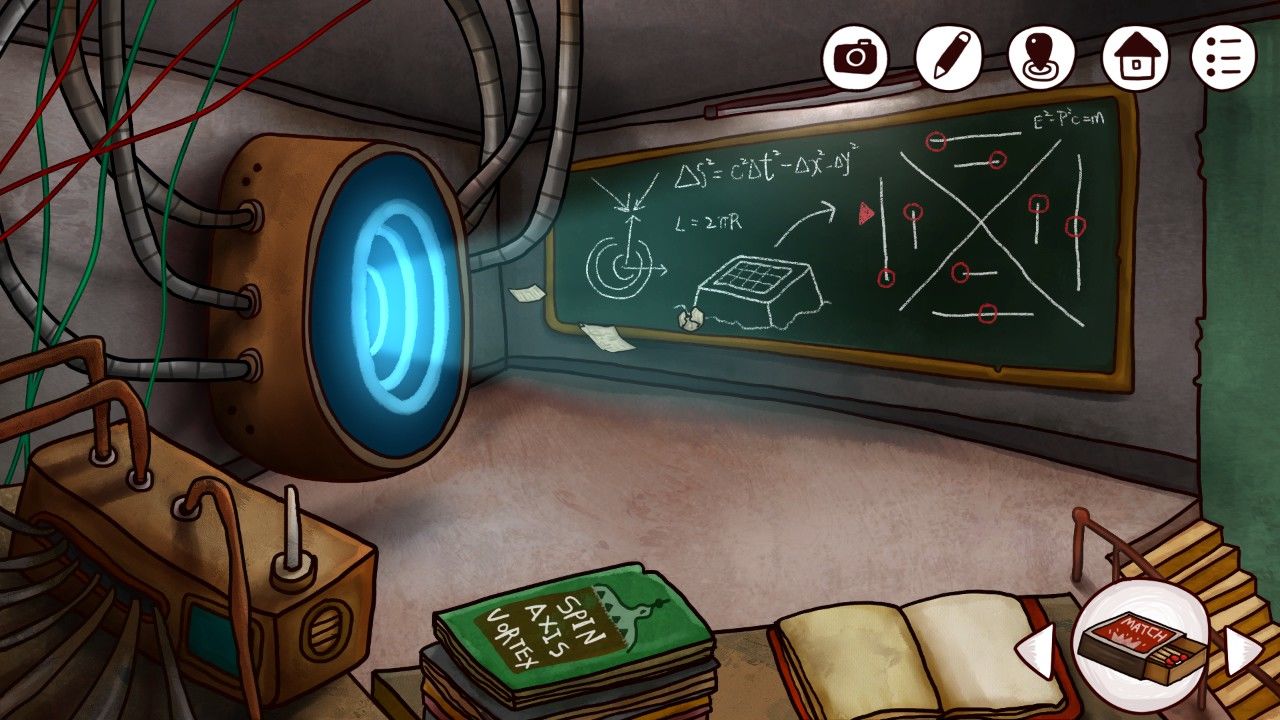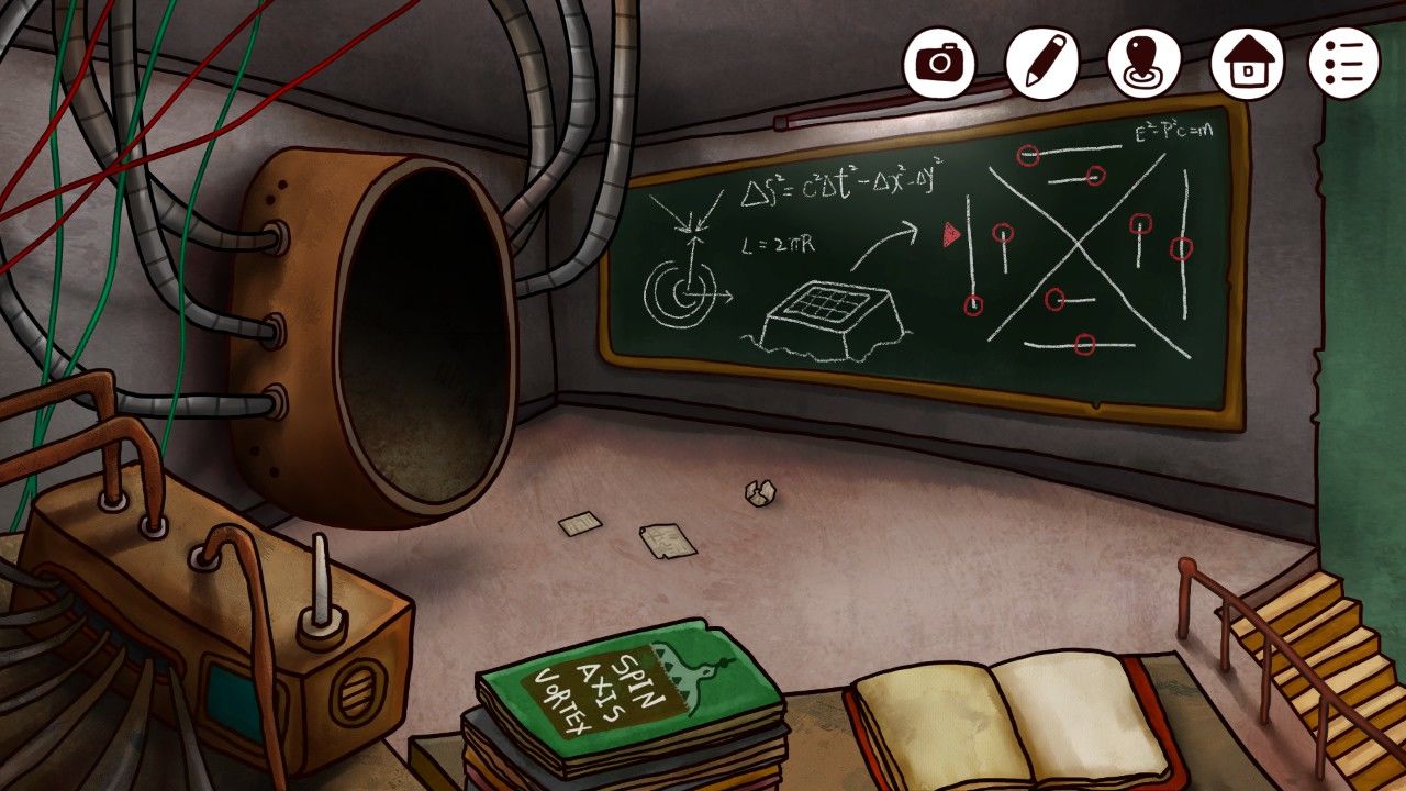 哦?左边的一定就是传说中的时间机器了,黑板上写了一定的公式,右边的是什么呢?看着这分布规律的红圈和特意标注的红色箭头,你明白了——真相只有一个!凶手就是你!(不好意思串台了。。。),于是你又使用了游戏的截图/笔记功能记下了黑板上的图像,尤其是,你没有忘记标注红色箭头的位置。听说老头子喜欢写写画画,也许在这本摊开的笔记中会记下老头子的经历吧。点击笔记本: