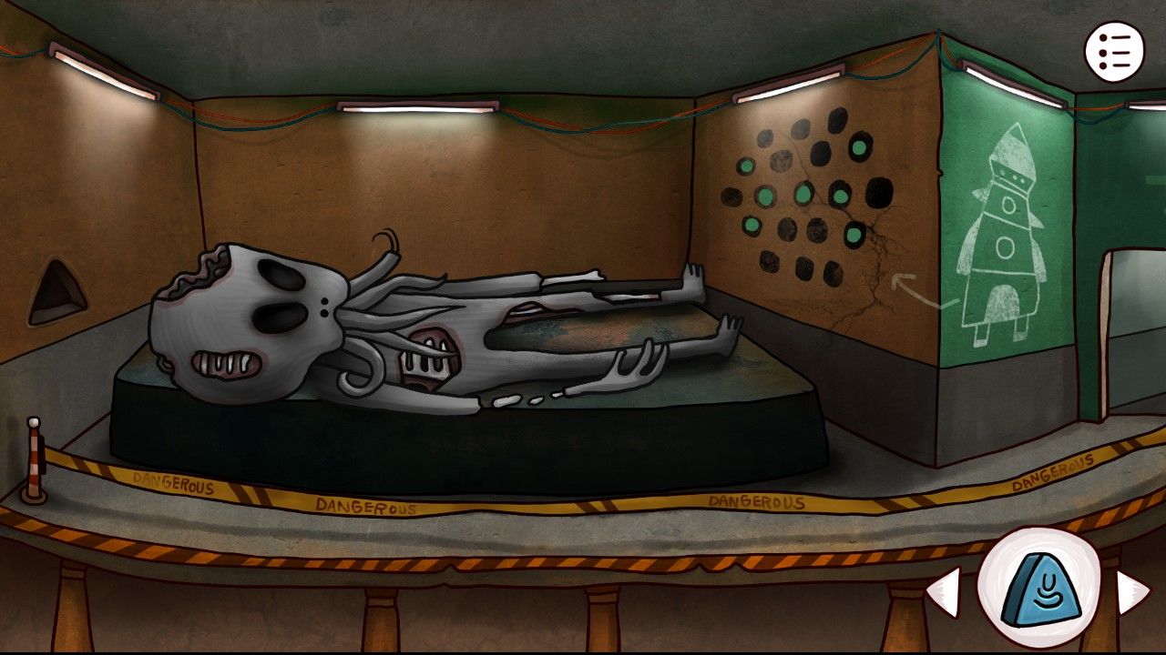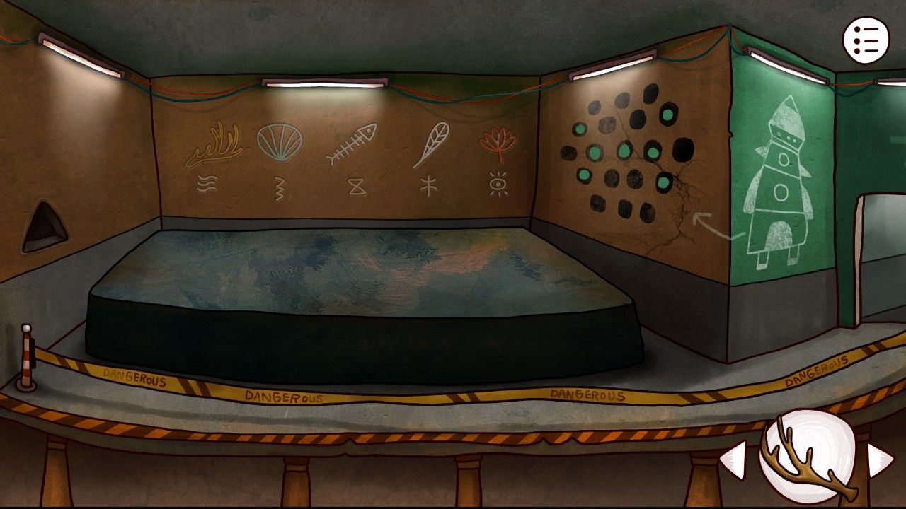 你准备进两个研究室看看,结果又是熟悉的机关门。该死!你不禁嘟囔起来,但也只能无可奈何的从左边的门开始解锁。你发现每个机关红点都不一样,也许把这些红点拉伸填满屏幕就可以了吧。(随机密码,以本局为例)。值得注意的是,每个小机关只能向两个方向延展,并且已经选定的方向是不可再延伸途中改变的。视频:工厂左侧大门进入左侧研究室,映入眼帘的是一具庞大的外星人尸骸,头顶有一块奇妙的石头,你拿在手中仔细端详,勉强认出是一块远古符石,这和空间时间石头可能没什么关系吧-。-但你还是收了起来,顺便也记下了外星人脚对应的墙上那副诡异的图案。