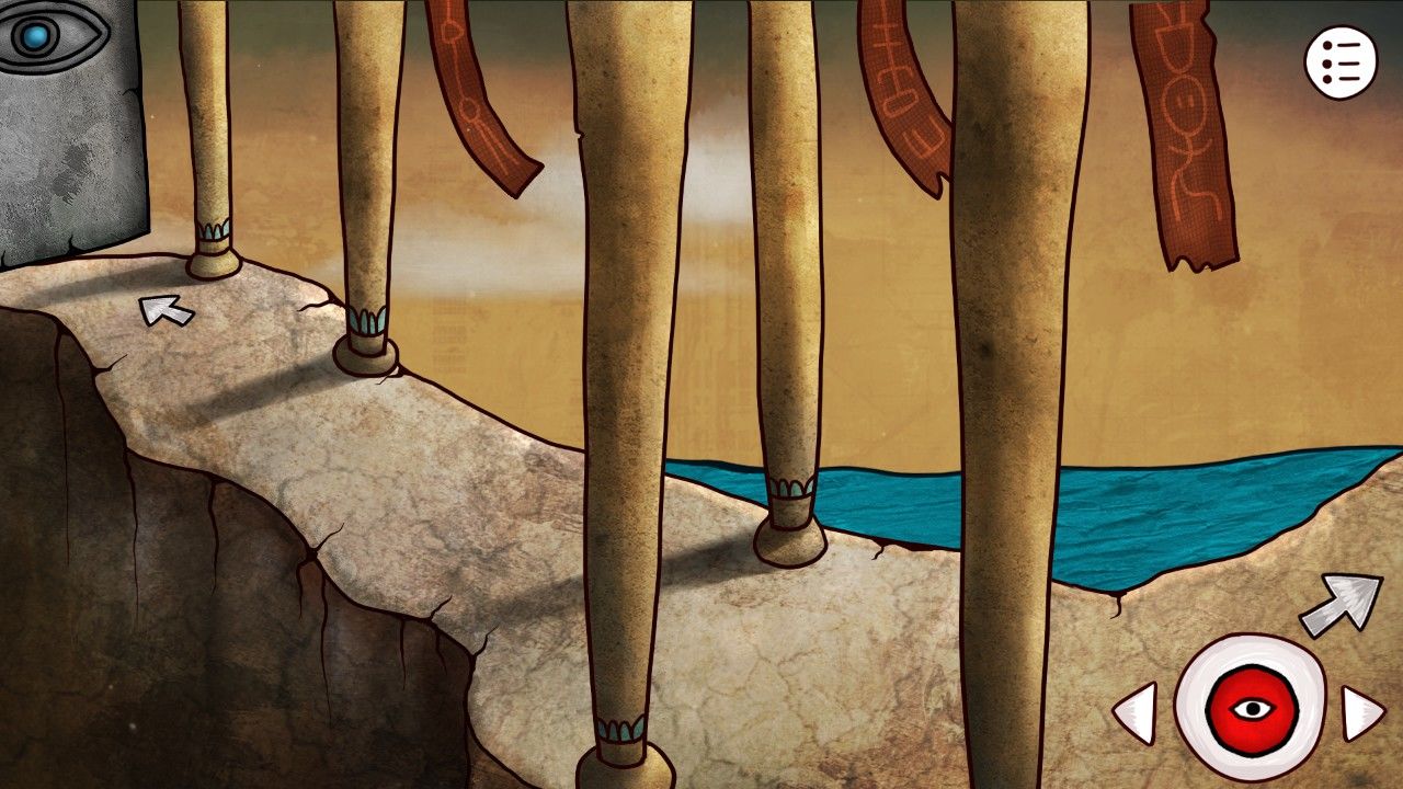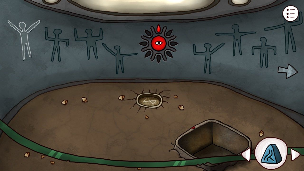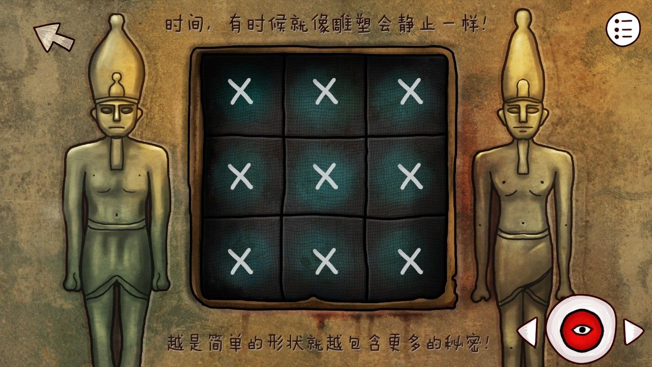 继续向前,你发现自己似乎走到了道路的尽头,奇怪的墙壁挡住了你的去路,看着墙壁上缺失的眼珠,你想到自己刚才得到的蓝珠子(很多小伙伴以为这个是在坑里挖的,是在之前神庙里狼首人身那里把矛头安在棍子上,它会吐出来蓝珠子的哦),决定碰碰运气(点击蓝珠子点击眼珠使用)