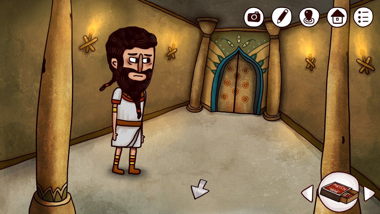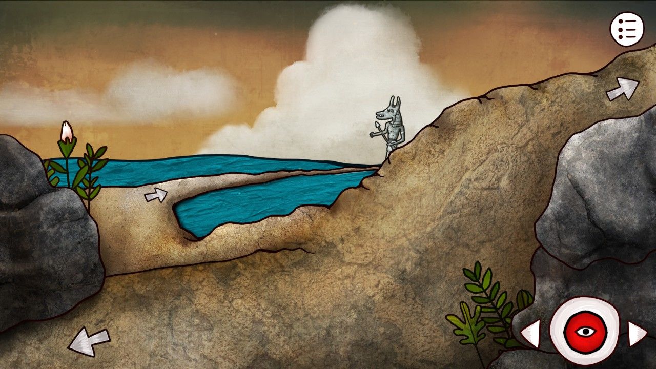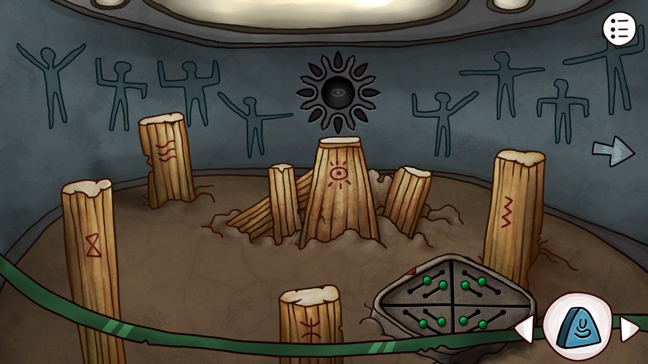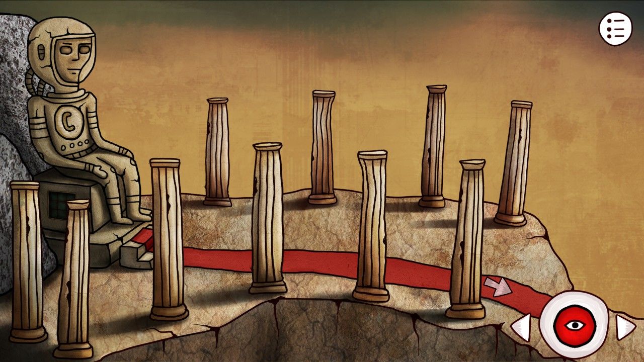 继续向前,你发现自己似乎走到了道路的尽头,奇怪的墙壁挡住了你的去路,看着墙壁上缺失的眼珠,你想到自己刚才得到的蓝珠子(很多小伙伴以为这个是在坑里挖的,是在之前神庙里狼首人身那里把矛头安在棍子上,它会吐出来蓝珠子的哦),决定碰碰运气(点击蓝珠子点击眼珠使用)