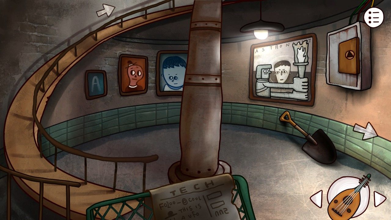 what???又是密码门,你们岛上的人到底多没有安全感啊!还好这次我有管理员给的密码,哼!心中窃喜的你按照管理员说的北南西东东北依次点击按键,成功打开了大门。进入灯塔,你险些被放在一旁的铲子绊倒。emmmmmmm,经过一阵犹豫,你还是拿起了铲子,准备看看有没有更好的地方放置它。转身看到墙上的宇航员图画也有些奇怪,走近你才发现,原来不知道哪位小朋友把自己的拼图块落下了,这怎么行!古道热肠的你立刻装到自己身上准备后面还给他人(铲子、拼图块入手)。