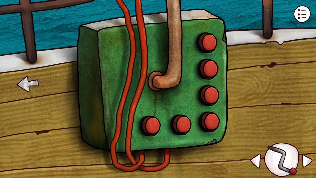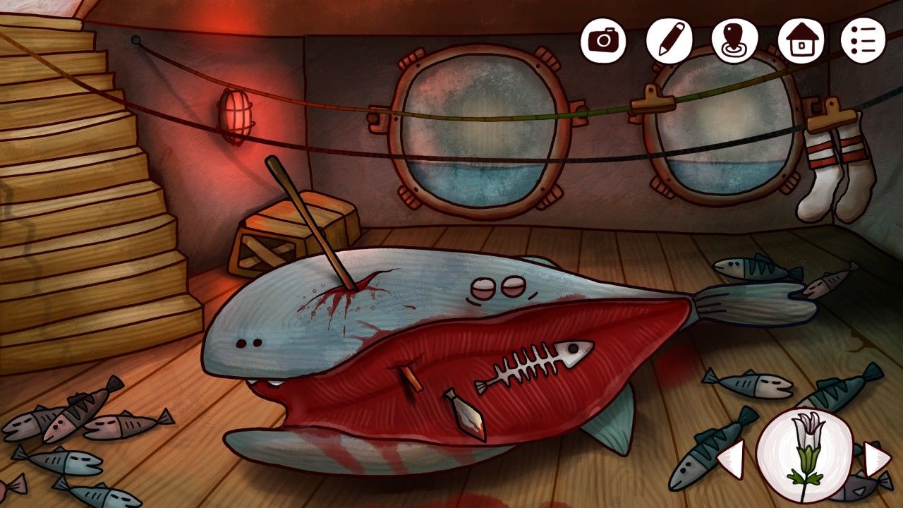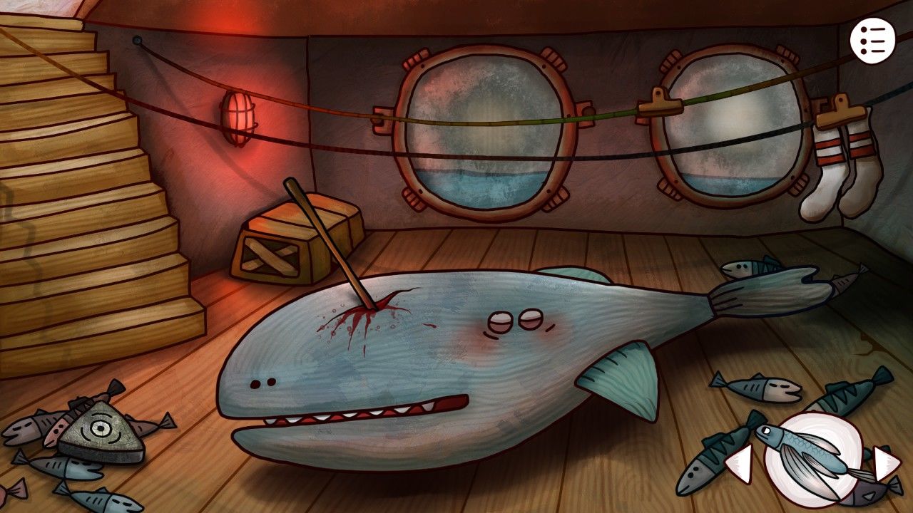 果不其然,又是熟悉的随机机制,不过这个谜题相当简单,只需要玩家通过合适的顺序把所有的按钮都按下即可,多做尝试即可轻松过关。附上这次的尝试视频。视频:甲板喇叭谜题刚刚点下所有的按钮,还没等你熟悉喇叭传出的旋律,只见一条蓝色的神奇飞鱼已经迫不及待的蹦跶上了甲板。。。。。。你的脑中忽然想到了那年学过的神奇课文《蓝色多瑙河》,不过鱼兄,你也太积极了吧,感情你埋伏半天就等这一刻?吐槽归吐槽,你也只能满足鱼兄的愿望,捡起傻飞鱼。你走进了船舱。