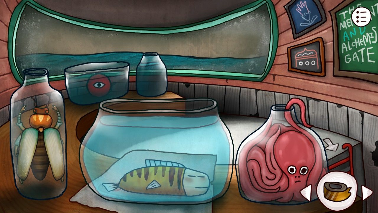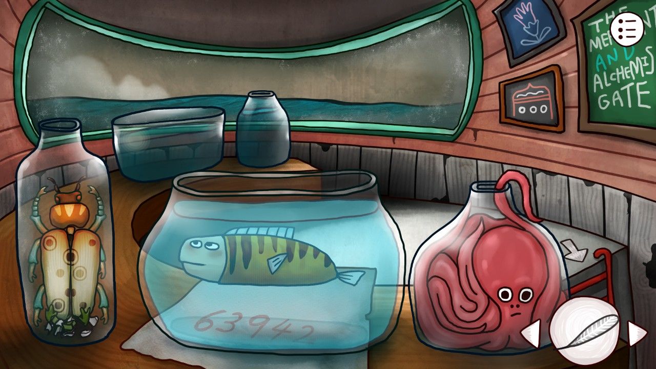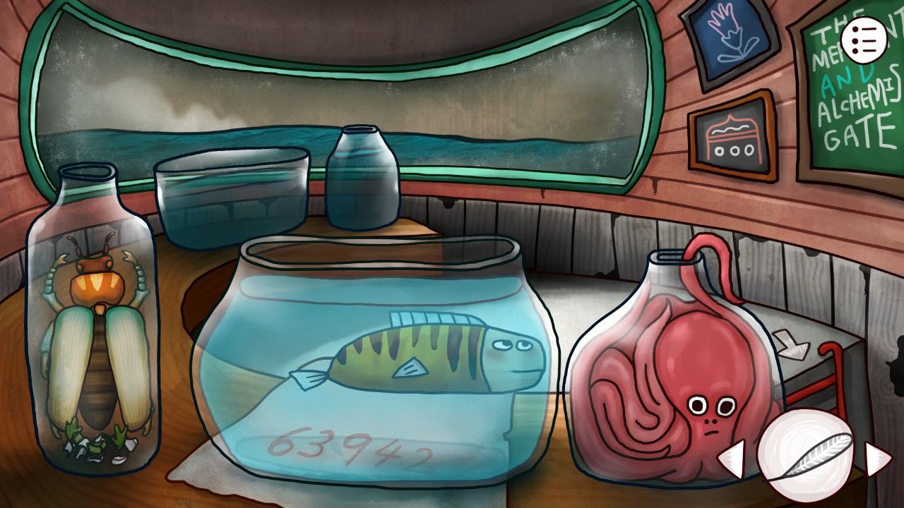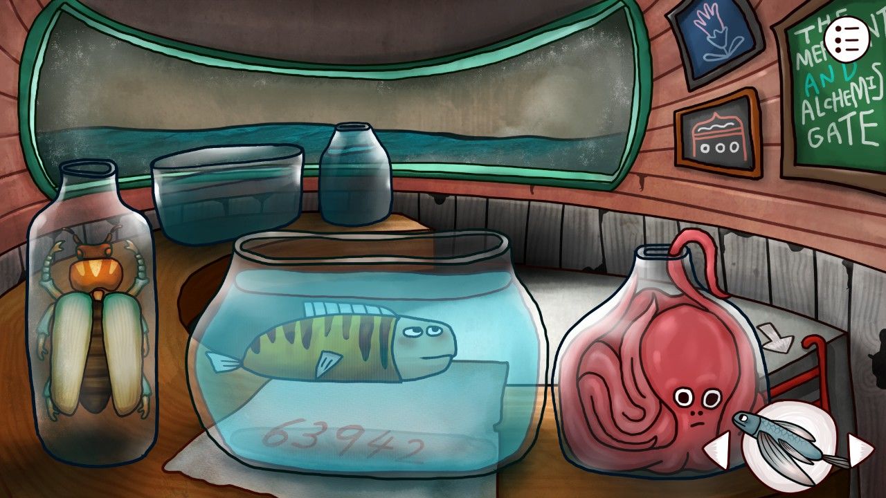 眼前红色的眼珠吓了你一大跳,还没等你多做反应,它已经自动跑到了你的口袋里(开玩笑的,还是需要你自己拿,红色石块入手)。刚才发生了什么?惊魂未定的你看到了另外奇奇怪怪的东西。鱼?鱼饵?我不是刚好有一个吗,不妨试试?你这样想着,把鱼饵扔进了睡着的鱼的鱼缸里。随着贪吃鱼浮起来吞掉鱼饵,鱼缸下压着的纸张上写的神秘数字也出现在你的视线里。