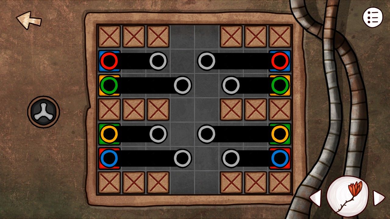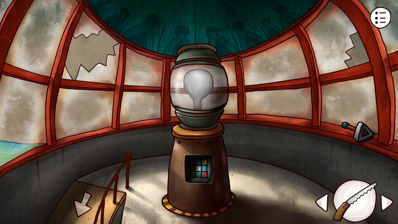 这里需要玩家把对应颜色的通道连接起来,就是红的全连起来连通两个红色灯泡这样子。这个谜题依然是随机生成的。。。。所以还是只发一下自己这里的过关方法。需要注意的点就是:上下左右可以拖动同一行/列的方块调整顺序,所以做好预判,想到应该放在什么地方再拖动才是过关的最佳方法。这里我玩过最复杂的是三个灰色可移动障碍,但是只要掌握好方法,开场把障碍块挪到明显的空处让它无法影响到后续行动,再以之为定位,合理摆放彩色方块就能轻松过关。举个例子,左下角的黄色是初始放置好的,最角落的地方明显需要放灰色障碍物,所以直接把最下面一行向右移动,让最右一列的灰色方块落下刚好落到黄色方块的左边,再向左拖动,复原黄色方块,就会发现灰色障碍已经被挪到最角落无法影响到后续的移动了。视频:灯塔灯光谜题解决掉让你稍感棘手的谜题,灯泡突然闪起的白光一瞬间晃瞎了你的双眼,游戏结束。hhh开玩笑的,站在残破的窗边,你似乎已经隐隐听到码头轮船的汽笛声。你已迫不及待想要回到港口,但是想到二楼排气扇还有东西没拿,这让强迫症的你瞬间忍无可忍,迅速回到一楼,用异形钥匙打开保险箱,拉下开关,回到二楼,从已经停止的排气扇中取出奇怪的摇柄。