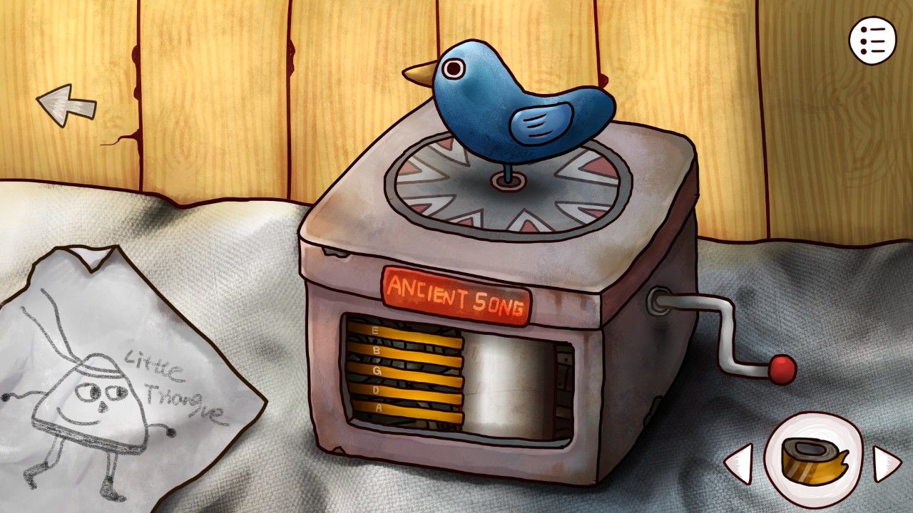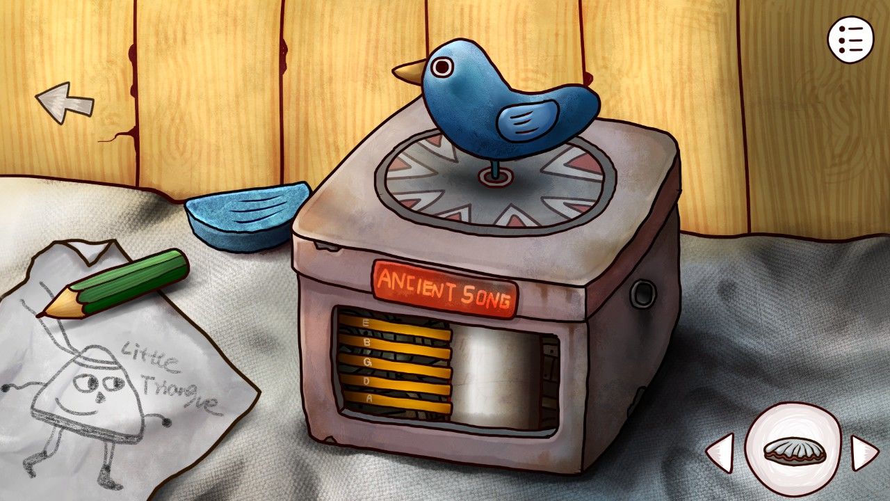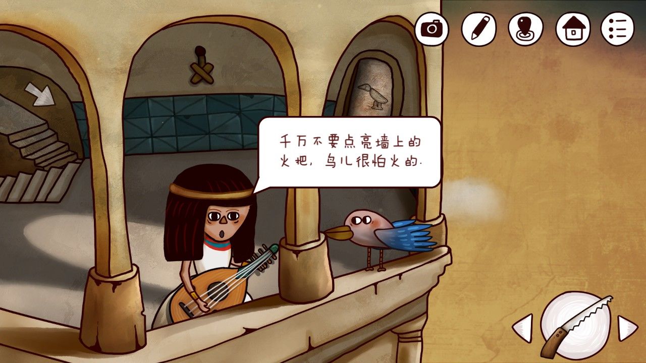 想到甲板上的神秘人,又想到这纷乱复杂的谜团,你只得狠下心来。用在婆婆那里得到的火柴,点亮了火把!点亮火把,点击蓝鸟,惊动鸟儿,从火把前飞过时会因为惊慌落下一片羽毛在栏杆上。你为什么要这样做!难得看到的蓝鸟就被你吓走了!小女孩惊讶的说到,不过算了,反正你教会了我这首旋律,我以后还可以继续邀请蓝鸟来这里做客。你点点头,羞愧让你不愿久待,转头看向了背后的那道门。