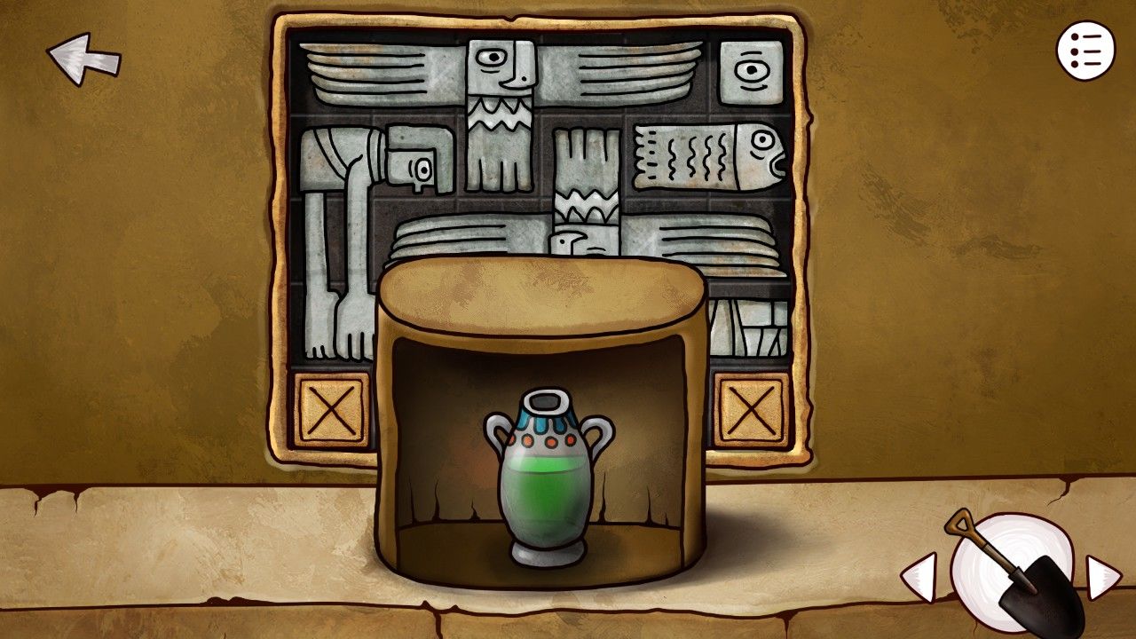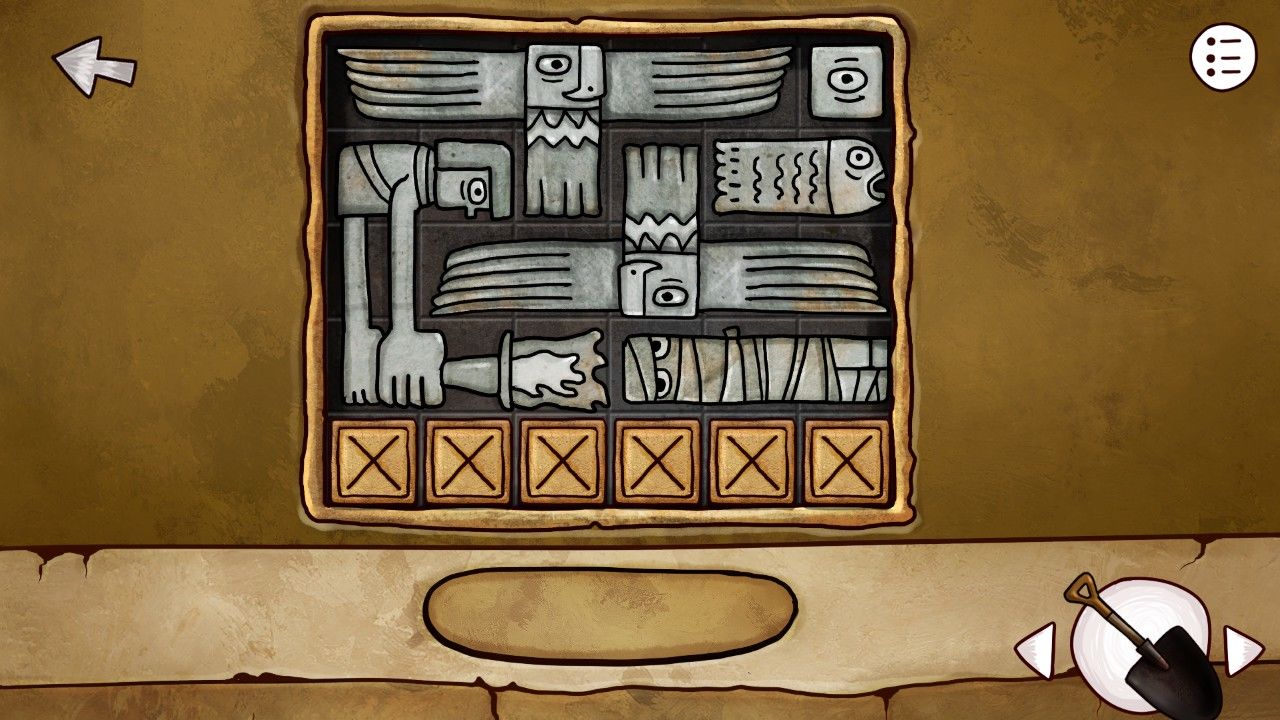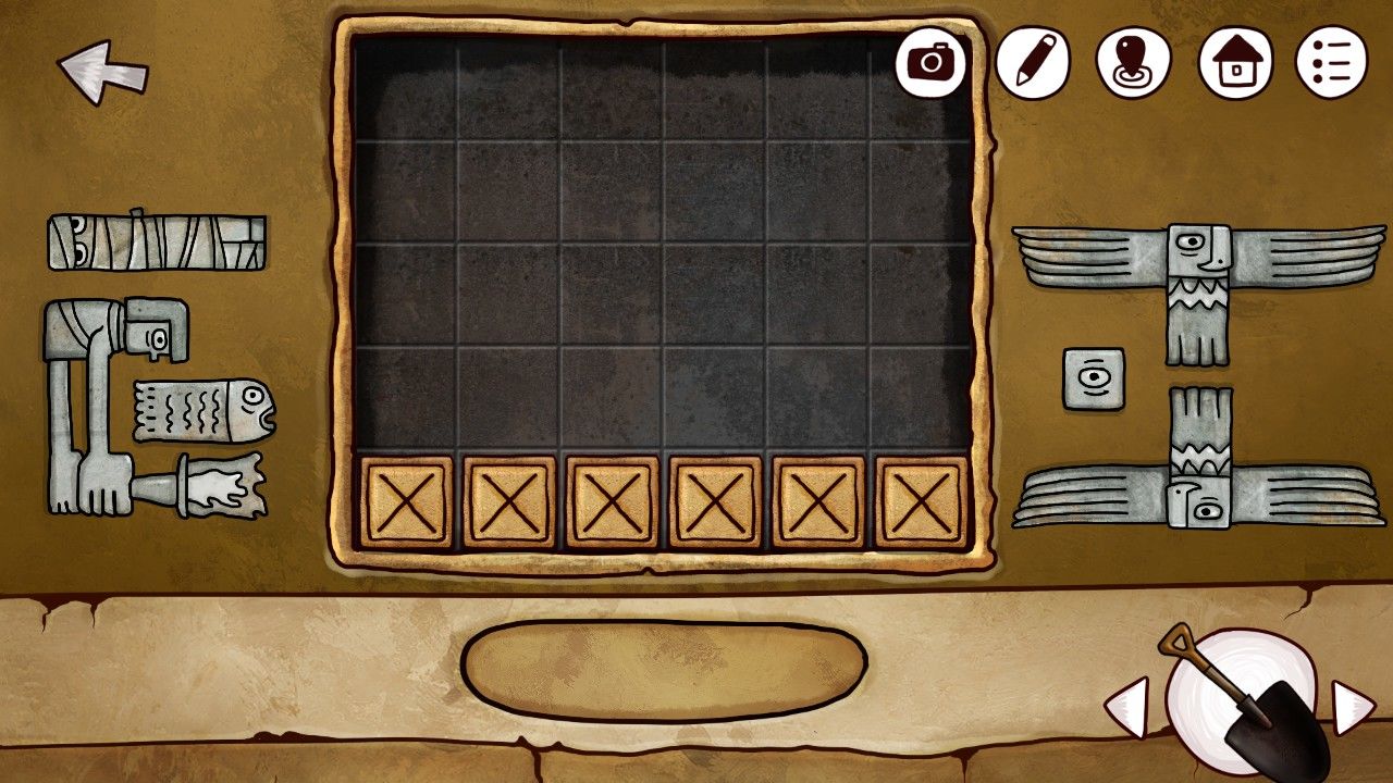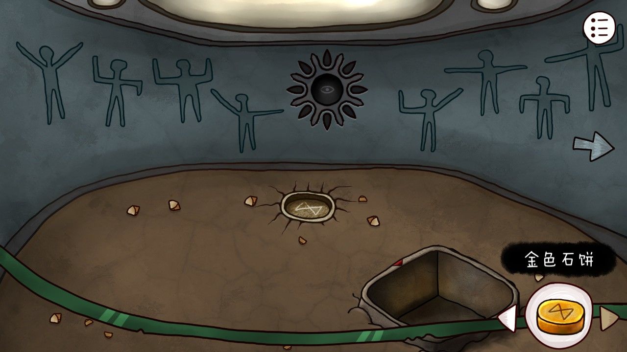 点击右边的陶罐,多次点击破碎之后取出中间的石饼,取出之前剖开大鱼得到的矛头,安在雕塑上的棍尖,轰隆一声,雕塑的嘴张开了,甚至还吐出了一个神秘的蓝珠子,拿走它。靠近前方的墙壁,你看着这奇怪的方块若有所思,觉得自己似乎见过这些东西,啊对了!是我在灯塔得到的拼图碎片!点击拼图块,点击谜题使用。