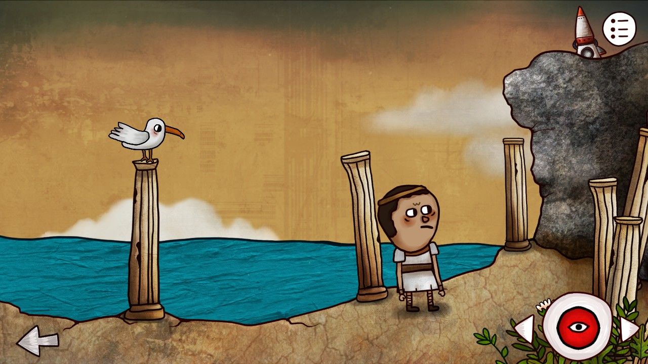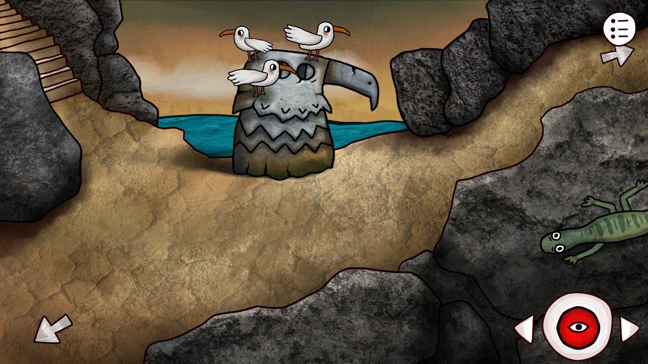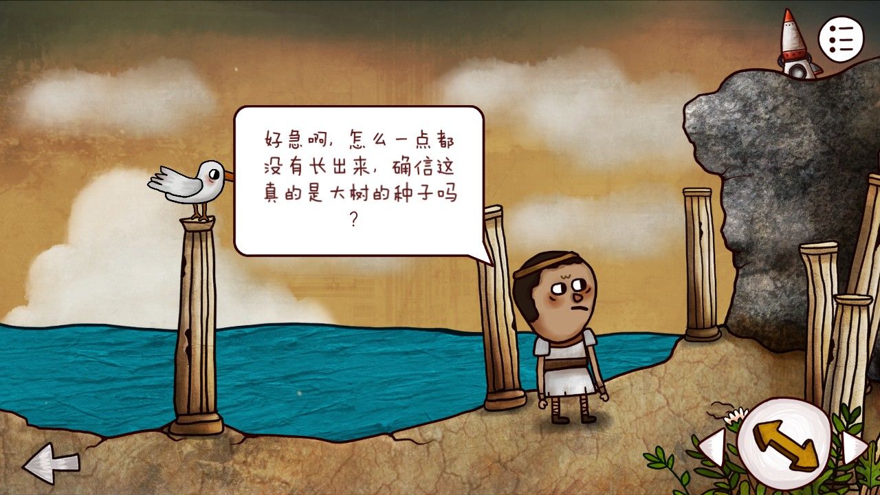 你上前与小男孩交谈起来,小男孩说:1.这上面有东西可惜爬不上去;2.他如果有个种子的话或许就有办法上去了,想让你帮忙找找种子;3.时空门附近的蜥蜴想捉住海鸥却总是没有办法。听到这里,你决定满足小男孩的愿望,并首先就从蜥蜴下手。返回时空门,你发现神庙阶梯那里的海鸥是可以点击的,蜥蜴也是可以点击的,并且两者的移动轨迹似乎有些奇妙的规律。