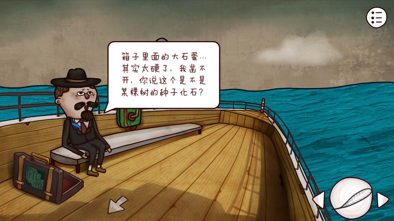 返回甲板,你把自己辛辛苦苦得到的蓝色羽毛给了眼前的小胡子。小胡子一阵感慨,终于见到了传说中的蓝色羽毛,这样吧年轻人,我的箱子里有我以前旅行攒下的一些奇妙的纪念品,你看有什么看的顺眼的就拿去吧。不不不,你太客气了,我就是顺手帮个忙,没必要的,你正准备谦虚几句。对了,我记得我好像有个很久之前得到的化石,似乎是一棵古树的种子,不知道还活着吗。小胡子悠悠说道。什么?!种子?!听到这里,你立刻话锋一转,那我就不客气了。于是你靠近了他的旅行箱,准备看看有什么好东西。
