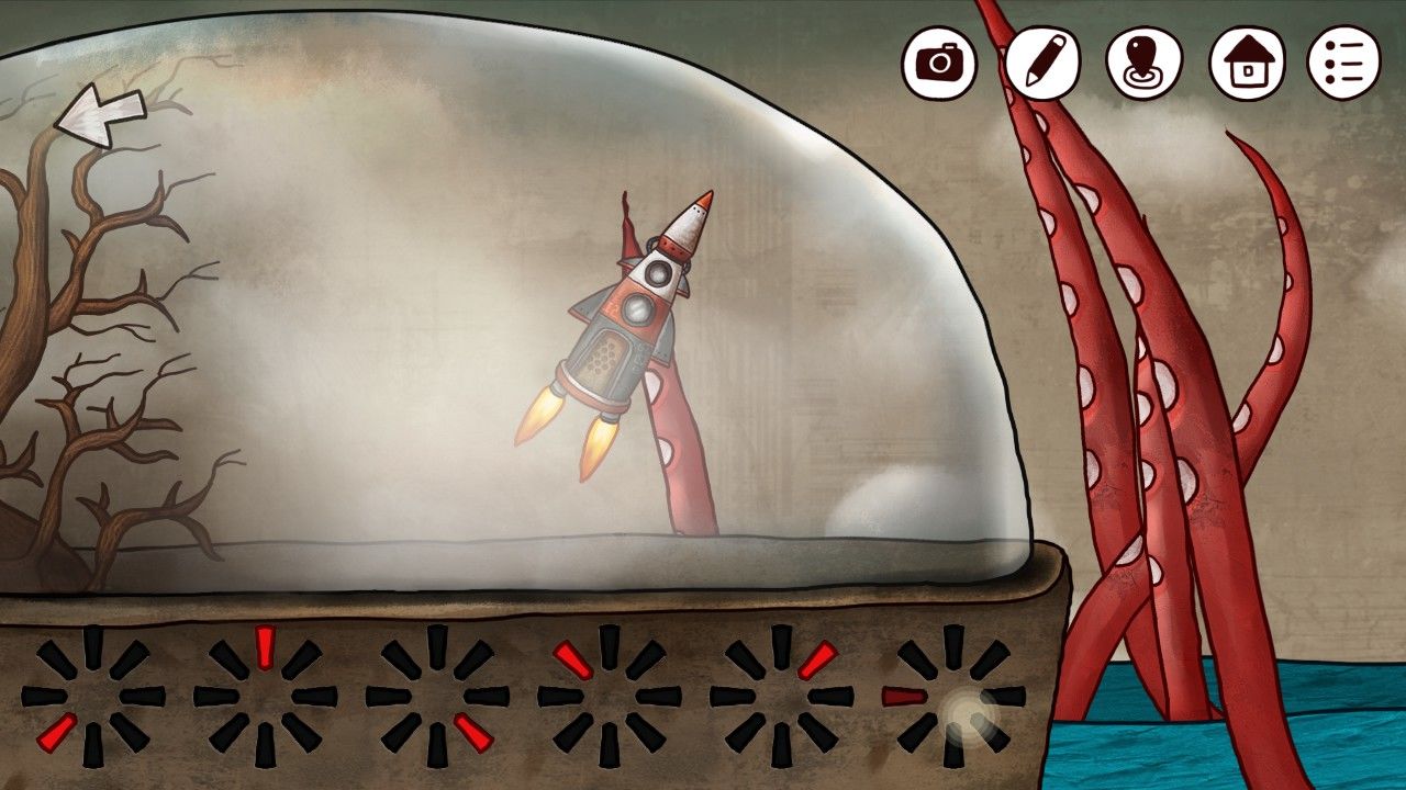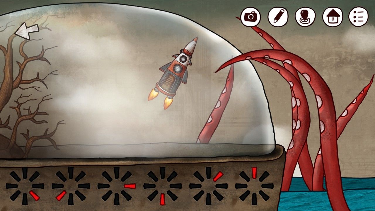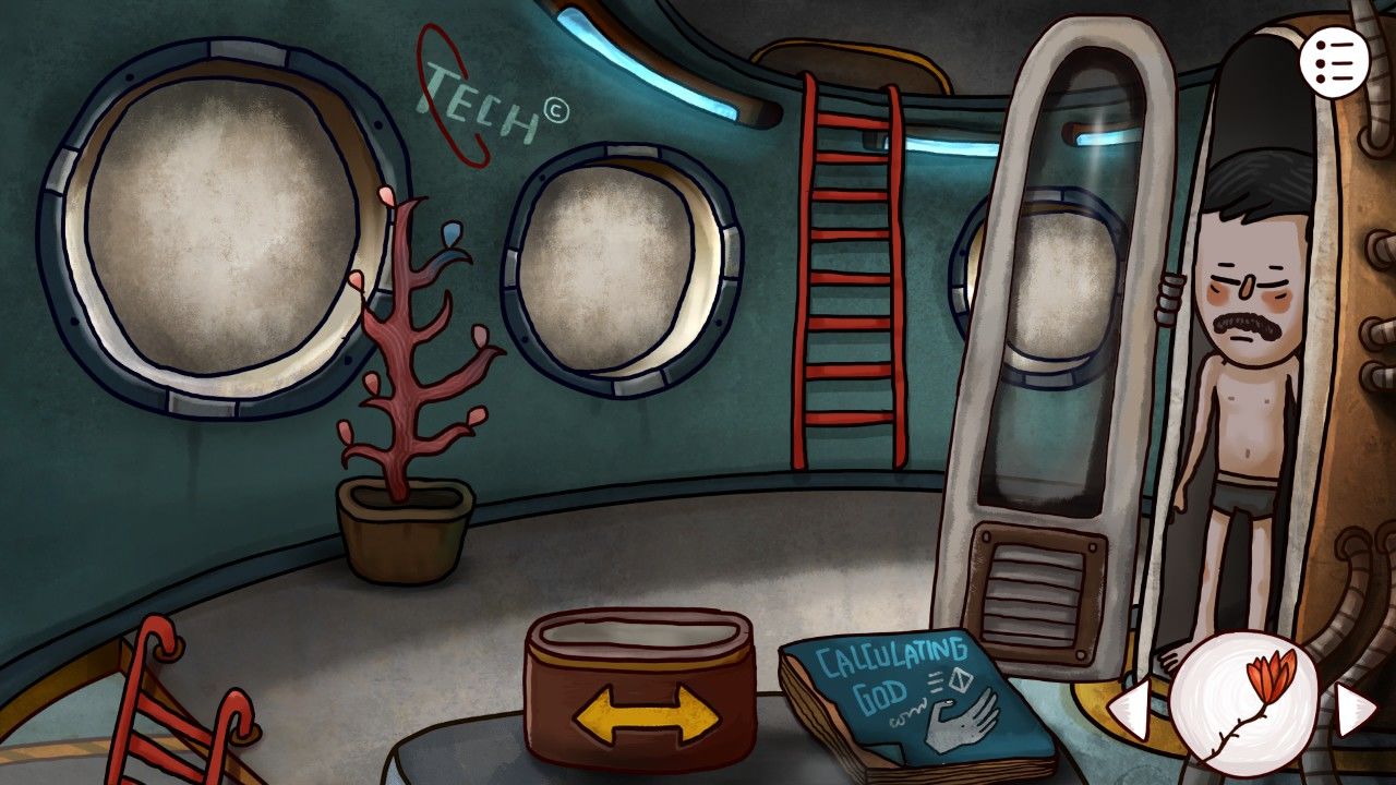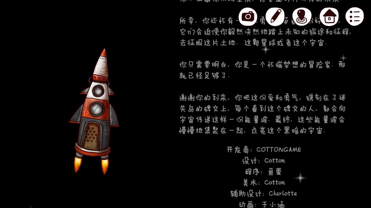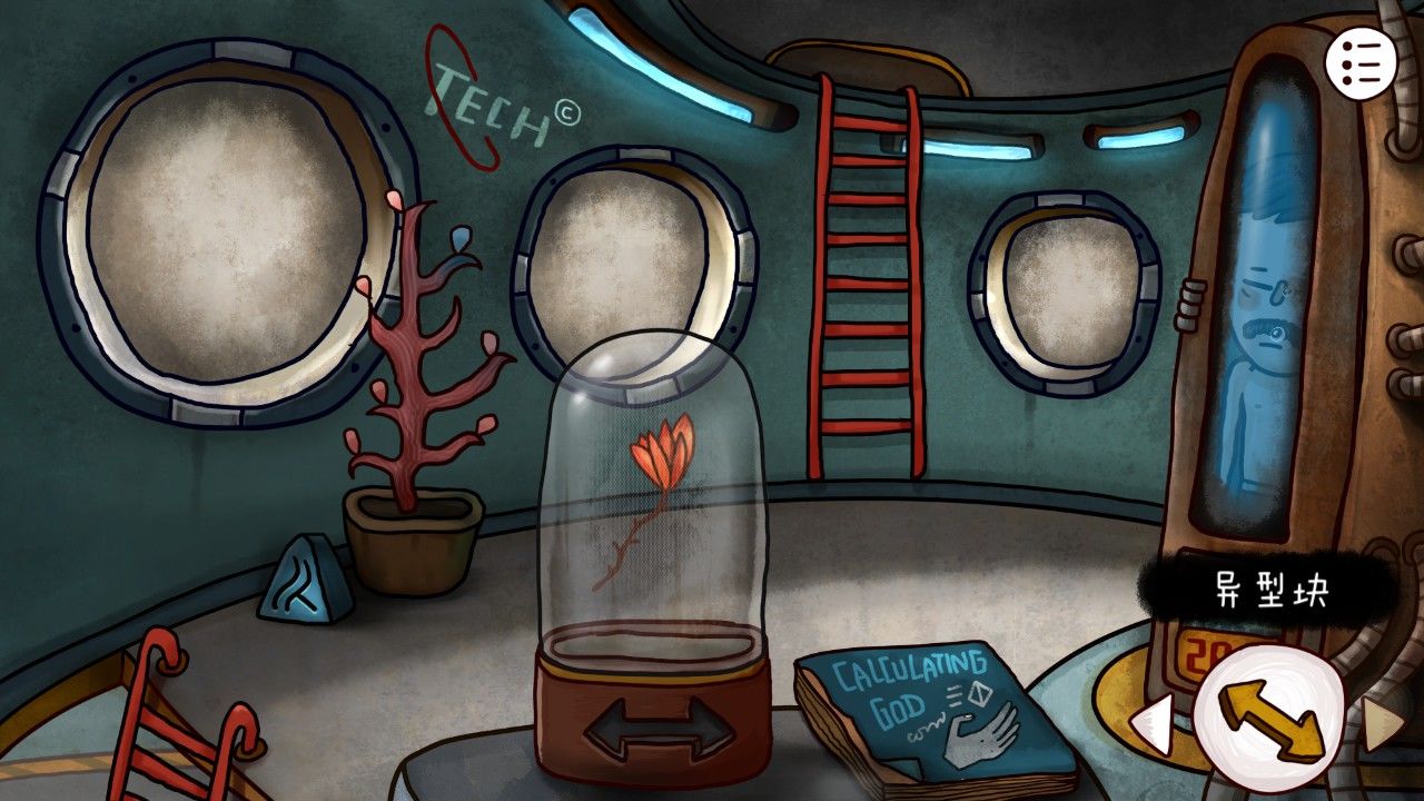 走入火箭一楼,点击能量盖,你发现这里似乎缺少了什么,大概是缺少能量吧,你想。走上二楼,左边的盆栽下是熟悉的蓝色石块,你捡了起来。又发现眼前的密封罐中,放着一朵奇妙的红花,最重要的是,你似乎手上有打开罐子的钥匙——双箭头。