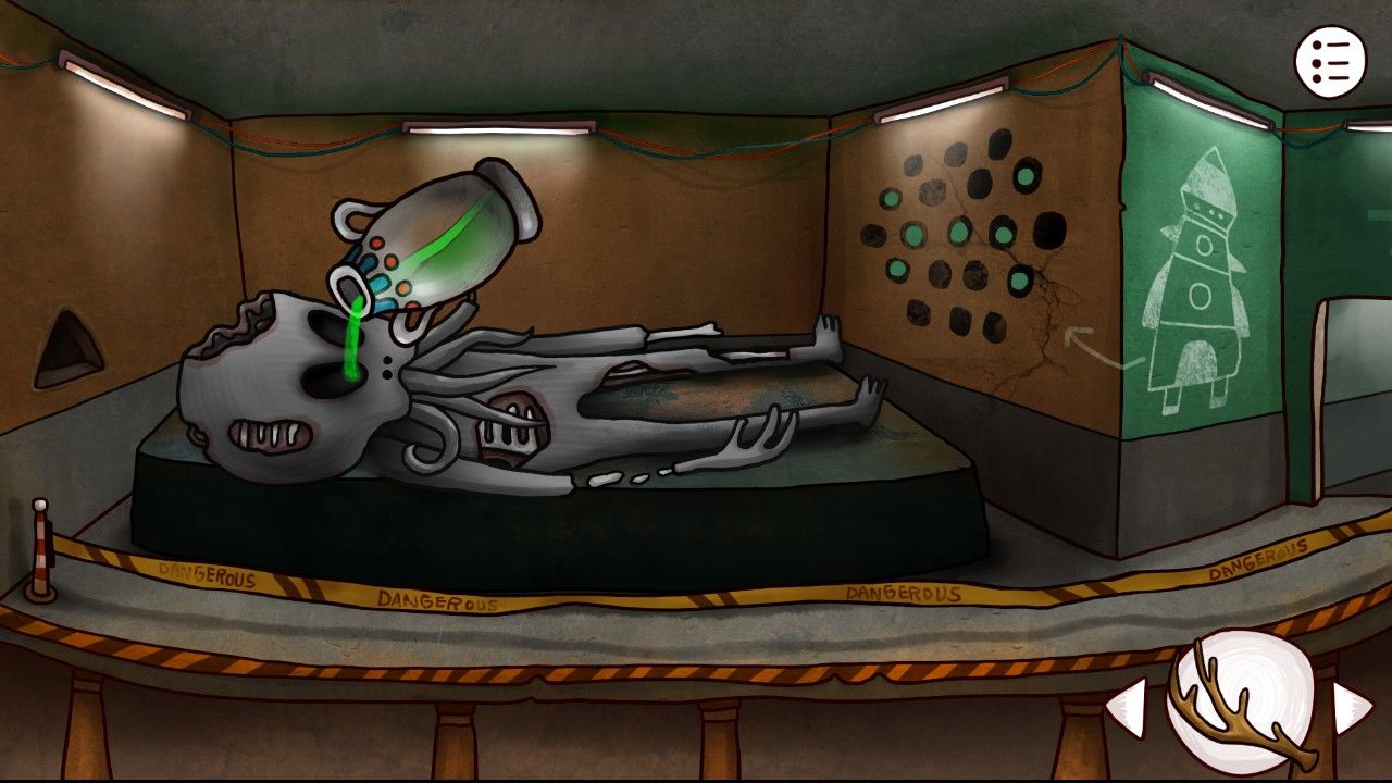 随着诡异的绿色液体从外星人口中不断灌入,外星人的身体也冒出来忽绿忽蓝的光芒,一道绿光闪过!外星人复活了!甚至还粉粉嫩嫩的,感觉随时可以吃呢!你上前向外星人搭话,可是它并没有理你(也许是担心被你吃掉),它诡异的抽搐了几下,在浑身绽放的刺眼闪光中神秘消失了,只留下对面墙壁上的五个符号和图案。你只得依依不舍的拍照,纪念外星人曾经来过。