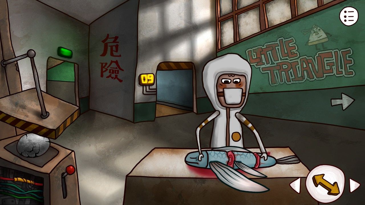 随着摇柄的缓缓转动,悦耳的音符也在你的眼前不断律动。八音盒下方的五个字母也暗含着某种神秘规律开始闪烁起来,你决定记下这串神秘字符——DGEGDA。结束了码头的一切,你准备回到工厂,把自己得到的飞鱼交给那名研究员看看。(点击飞鱼点击研究人员使用),随着熟练的咔咔两刀,研究员把飞鱼剁成了三截(大哥你确定你不是个厨子????)研究员拿起一段飞鱼仔细端详。这也没什么不同啊,奇怪,他嘴里还嘟囔着,不过,比起飞鱼,也许船舱里那巨大的尸骸。欲言又止的他却不明白,这短短几句话给了你无限的启发,你决定拿起他的刀,会船舱看看(点击桌面的刀,带走)。不过在这之前,你并没有忘记,拿出之前得到的胶带,把左下方那因为线路破损而坏掉的机器修好(点击胶带,点击破损的电线使用)