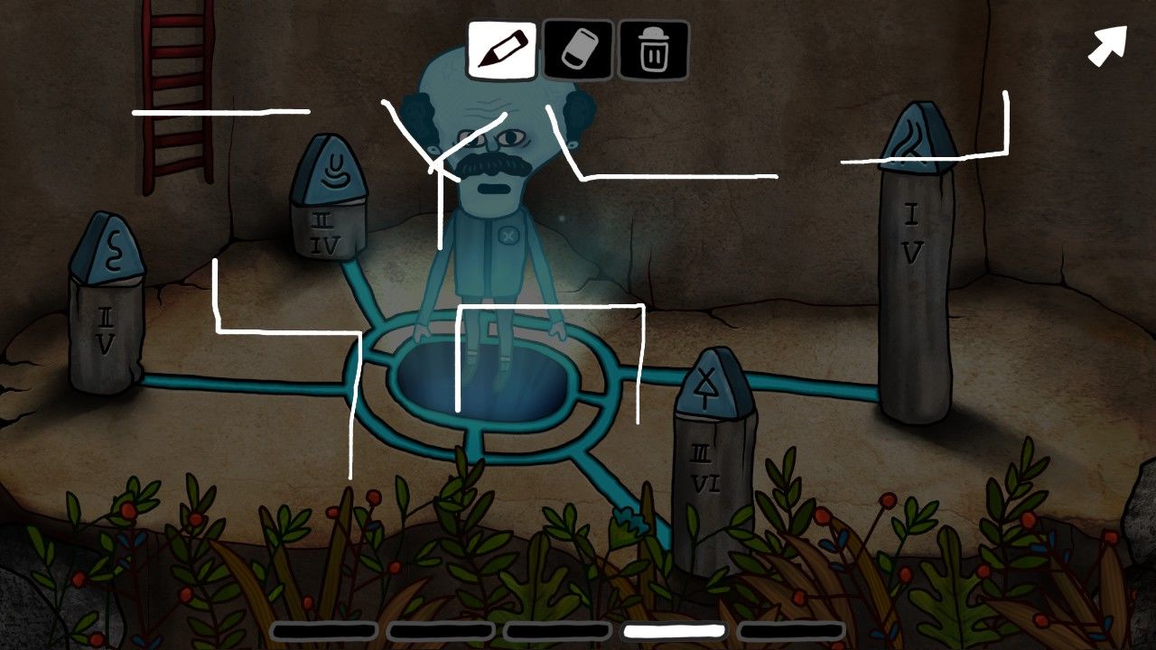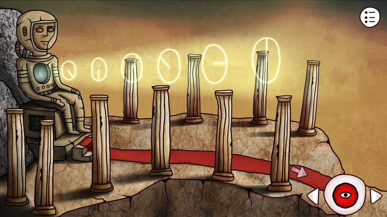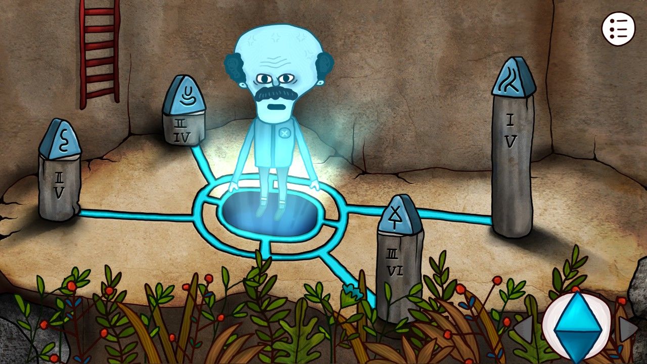 一道蓝光闪过,地面的坑洞里突然钻出来一个光头!和这位神秘人物对话,他竟对你能找到这里一点也不惊奇,尤其是他还说,他在数十光年之外的星系等着你,莫非,这段旅途才刚刚开了个头?不待你细想,老头突然开始做起了诡异的健身操,联系到之前石室墙壁上的人物图像,你隐隐明白,这是老头在向你传达机关的顺序,于是你拿起笔记下了这一切。