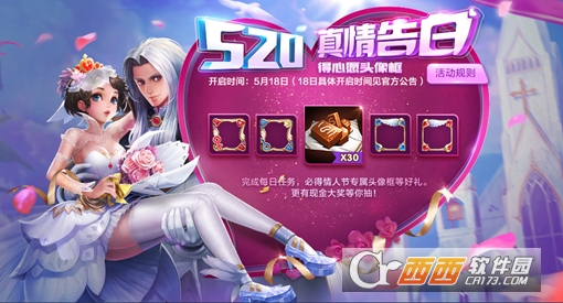 5月20日当日登录即可领取520爱心礼包*3+亲密玫瑰*5+甜蜜520礼包*1,开出520铭文碎片、520钻石好礼!