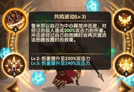 鲁米苏以自己为中心释放冲击波,对经过的敌人造成240%的攻击力伤害。冲击波经过自己的图腾时会再次激活改图腾放置时的效果。这个技能不光能让鲁米苏打出高额伤害,在此同时还可以向地下插入一个图腾,吸引敌军火力,达到自保的能力。