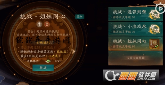 特殊挑战:灵力不超过55、降妖师和变身妖灵不死、最多一只妖灵死亡、不携带木系妖灵