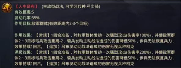 【人中吕布】是笔者最喜欢的主动物理输出战法,该战法对敌军施加的负面效果十分可观,并且其攻击距离能让己方大营直接攻击到敌军大营,这一点是【雄兵破敌】和【折戟强攻】所不能比拟的。