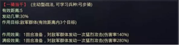 【一骑当千】可造成超高的输出,有效距离5,攻击目标3的属性在主动战法里堪称完美,虽然百分之三十的发动几率不算很高,但是超高的伤害可弥补这一点。