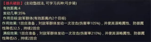 此战法弓兵无法学习,所以适用这个战法的武将受到一定限制,玩家在选用时请自行斟酌。