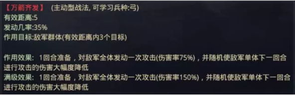 【万箭齐发】可由五星群吕布、五星汉步董卓拆解获得,该战法在造成伤害的同时,还能降低敌军下回合造成的伤害。