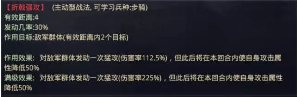 【折戟强攻】是一个很特殊的主动物理输出战法,是众多高输出物理战法中唯一的瞬发战法,但有得必有失,此战法发动后的也会对己方造成负面效果。