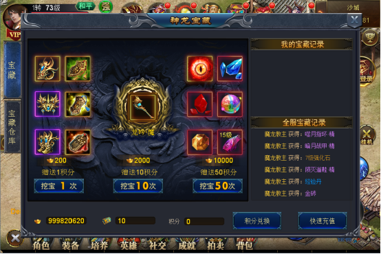玛法大陆当中隐藏着许多宝藏,等待着勇敢的战士前往发掘,通过神龙宝藏,玩家可以方便快捷的寻找这些传世珍宝。神龙宝藏一共有三种挖宝方式,分别是一次、十次、五十次,消耗元宝的数量分别是200元宝、2000元宝、10000元宝,当然也可以用神龙卡来代替。通过挖宝可获得各职业极品转生装备、嗜血瞳晶、大量经验丹等珍稀道具,甚至还有几率获得极品金色装备,经验丹使用后可以获得大量经验,加快升级速度。另外神龙宝藏获得的装备会自动放入宝藏仓库当中,可以根据需要随时取出。宝藏仓库容量巨大,不必担心背包不足的情况,将低级的装备可以回收,高级装备可以自用也可以在拍卖行中出售。