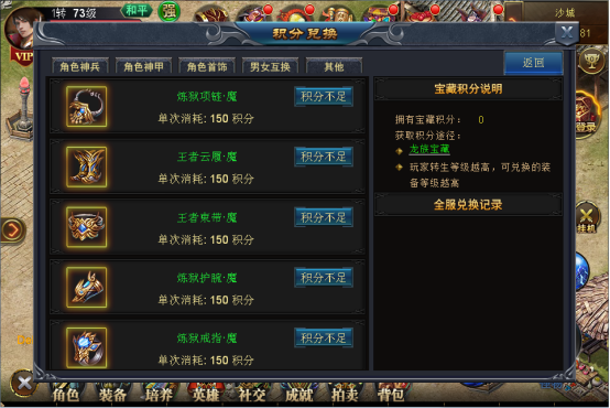 每挖宝1次,将会获得1点积分。积分可用于兑换金色装备、特戒碎片,也可用于男女装备的转换。由于神装礼包中的金色装备是没有项链和鞋子的,所以通过积分兑换70级的项链和鞋子是性价比非常高的选择哦!