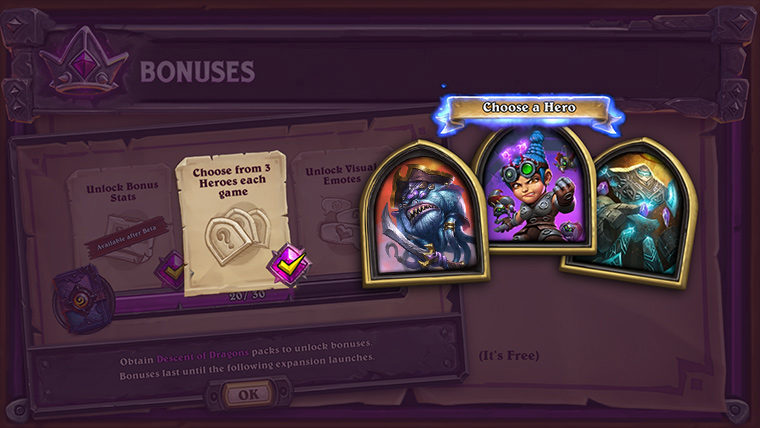 获取了20包卡牌包的玩家在游戏开始时可以选择的英雄从两位增加到三位。