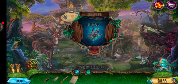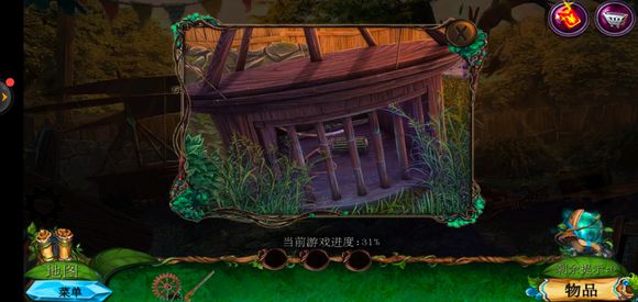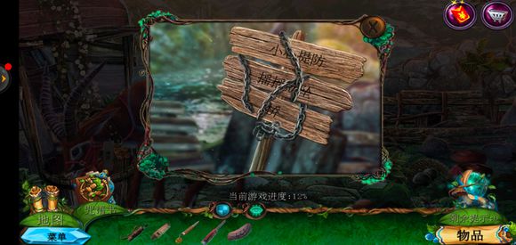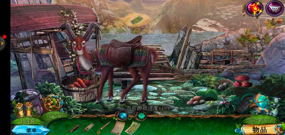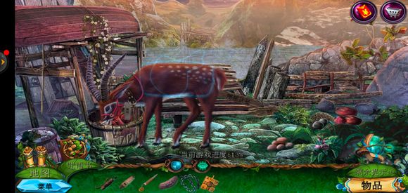 进入桥头,用锉刀把木牌上的链条锉断,获得铁链,点击鹿脖子,用小刀获得方形嵌入物