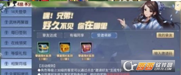 玩家可以给自己的好友发送自己的邀请码。好友注册登录武林外传手游,你就能获得邀请礼包,好友也能获得受邀礼包。
