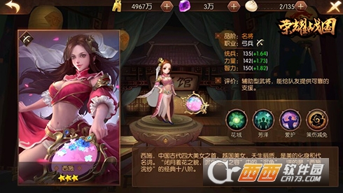 西施是一个初始为三星品质的弓兵职业武将,在技能方面的表现上,