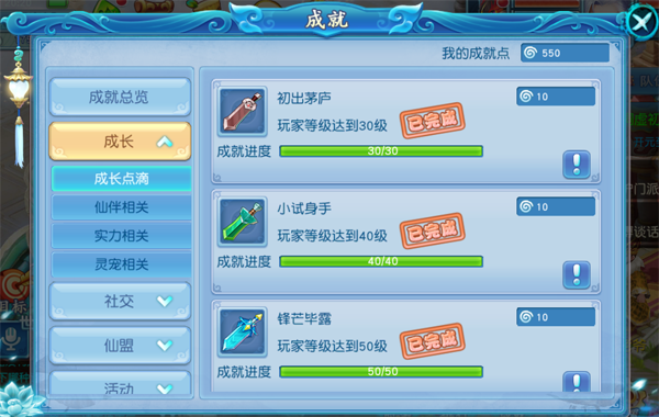 完成成长点滴、仙伴相关、实力成就、灵宠相关即可获得成长成就~