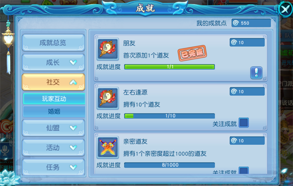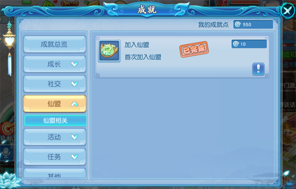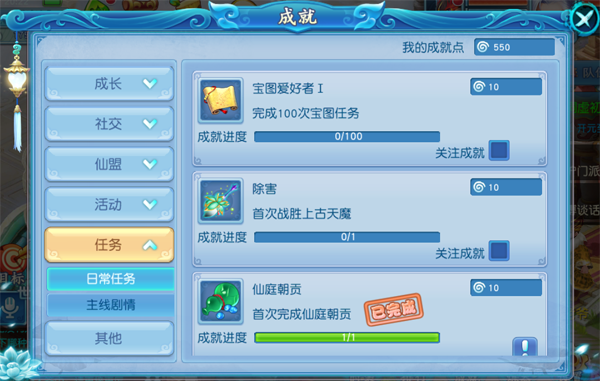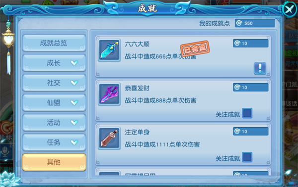 完成相应成长、社交、仙盟、活动、任务、其他等综合成就,即可获得相应奖励。