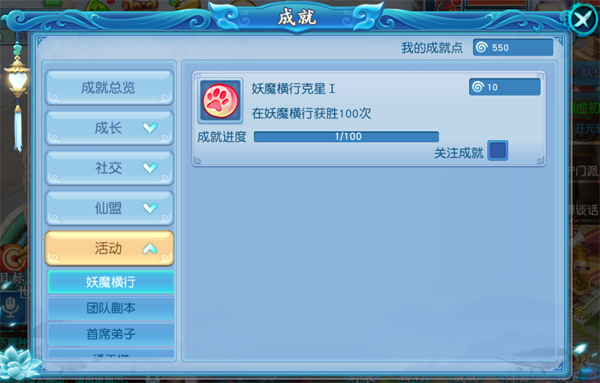 达成妖魔横行、团队副本、首席弟子、通天塔、其他等等活动即可领取活动成就