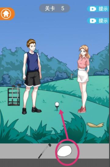4、再把【球杆】给男生,让他挥动球杆打球。
