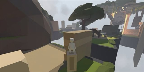 先将身边的木块放到跷跷板一侧,向被抬起的另一侧冲刺跳跃后抓住对面高台上的木板,可将木板拉下来。
