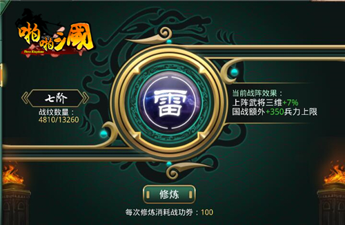 战阵系统可提升所有上阵武将的三维属性,并在国战中,对自身部队有额外的兵力加成。当达到最高等阶十阶之后,还将解锁战阵排行榜,上榜的玩家在国战中不但能提升更多兵力加成,对后续版本国战“君主竞选”等玩法也有所助力。