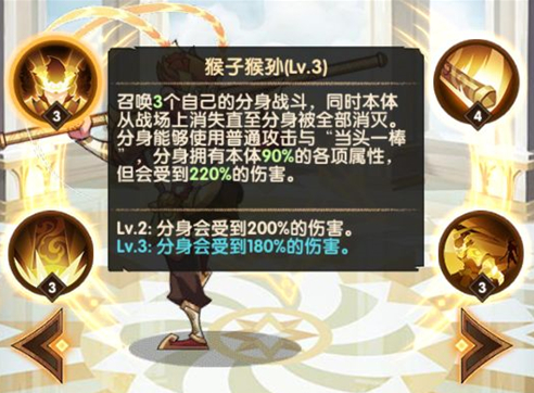 召唤出三个分身,本体会消失直到三个分身死亡,分身拥有本体90%属性,承伤220%,可以使用当头一棒。