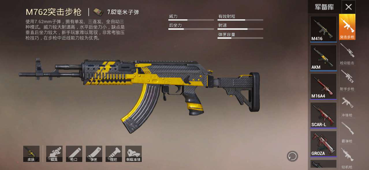 M762在登场和平精英之后,已经完全的把AKM的近战地位给完全取代了。同样都是装配7.62mm口径子弹的突击步枪,它最大的特点是完全不输AKM的伤害,匹敌M416的射速。使它在近战之中,完全是枪王的表现。可以装配握把配件,装配有激光瞄准器的M762,腰射就是一个杀神的存在。由于射速快,导致后坐力非常的大,不是很推荐新手玩家使用。配件推荐-枪口补偿器+快速扩容弹夹+激光瞄准镜