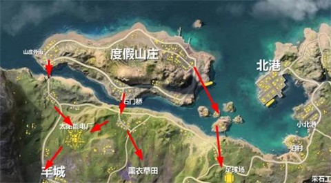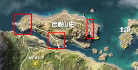 度假山庄,位于地图的北偏南,是一座独立于大陆的岛屿,其内分布有大量的房屋和资源,可满足多支队伍的发