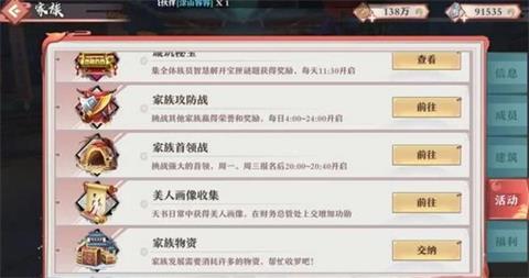 家族功勋的获取主要通过家族活动获得,这里和大家主要说的是家族物资和美人画像收集。