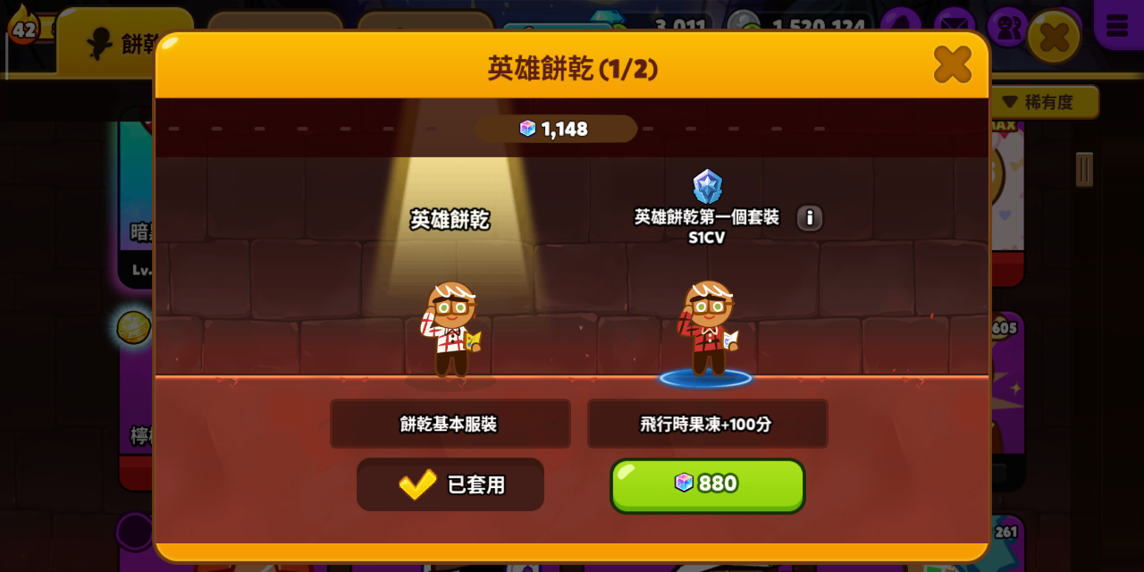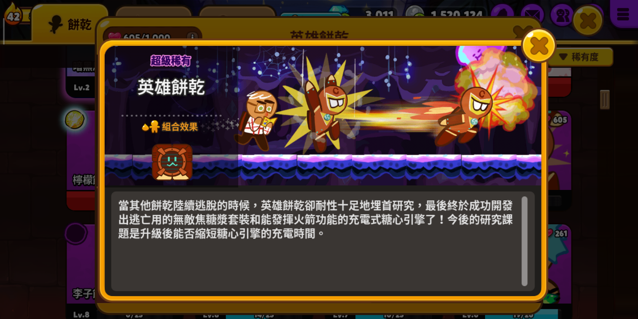 当其他饼干陆续逃脱的时候,英雄饼干却耐心十足地埋首研究,最后终于成功开发出逃亡用的无敌焦糖浆套装和能发挥火箭功能的充电式糖心引擎!今后的研究课题是升级后能否缩短糖心引擎的充电时间。