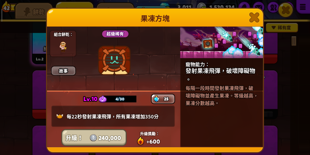 宠物能力:发射果冻飞弹,破坏障碍物。