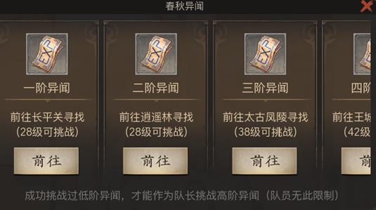 春秋异闻–首日两次二阶异闻经验最高,但需要先找一个打过一阶的人带队